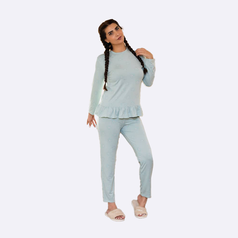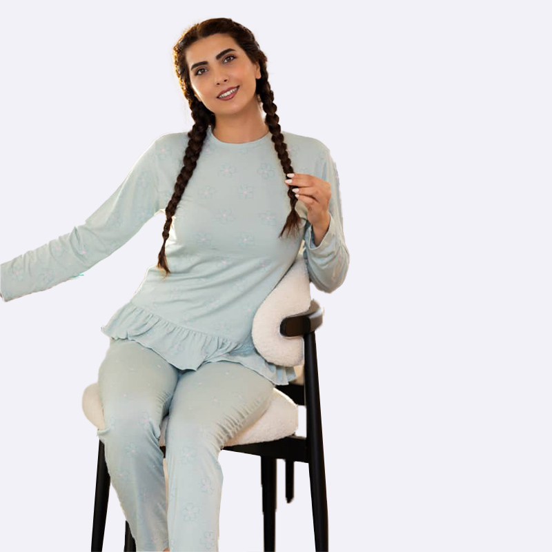 طقم بيجامة قطنية ناعمة بأكمام طويلة، يتميز بقميص مزين بكشكشة (كُمَر) عند الخصر ونقشة ورود ناعمة، ومناسب للارتداء المنزلي المريح.