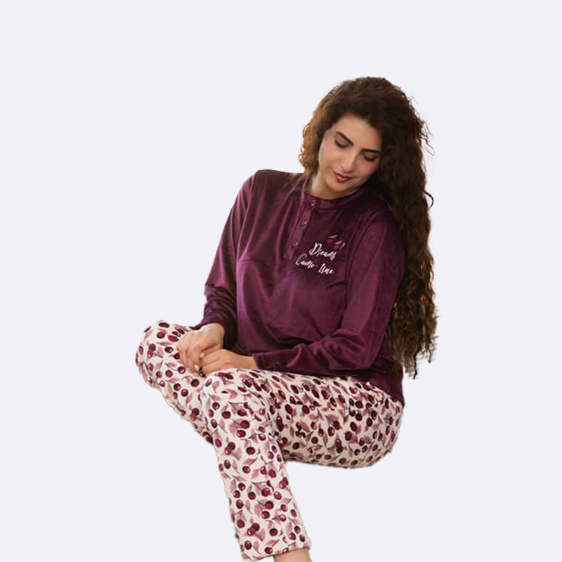 طقم بيجامة شتوي دافئ من قطعتين. يتميز ببلوزة من خامة ناعمة مخملية بقبة عالية مع تطريز على الصدر، وبنطال طويل مطبوع بالكامل. مثالي للشعور بالدفء والراحة.