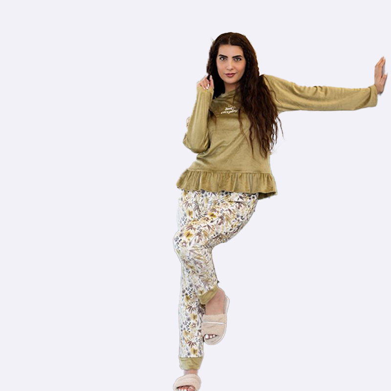 طقم بيجامة من خامة مخملية ناعمة. يتكون من بلوزة بأكمام طويلة مع كشكشة (بيبلوم) حول الخصر وتطريز على الصدر، وبنطال (ليغينغز) ضيق مطبوع بنقوش زهور، مثالي لإطلالة منزلية مريحة ودافئة.