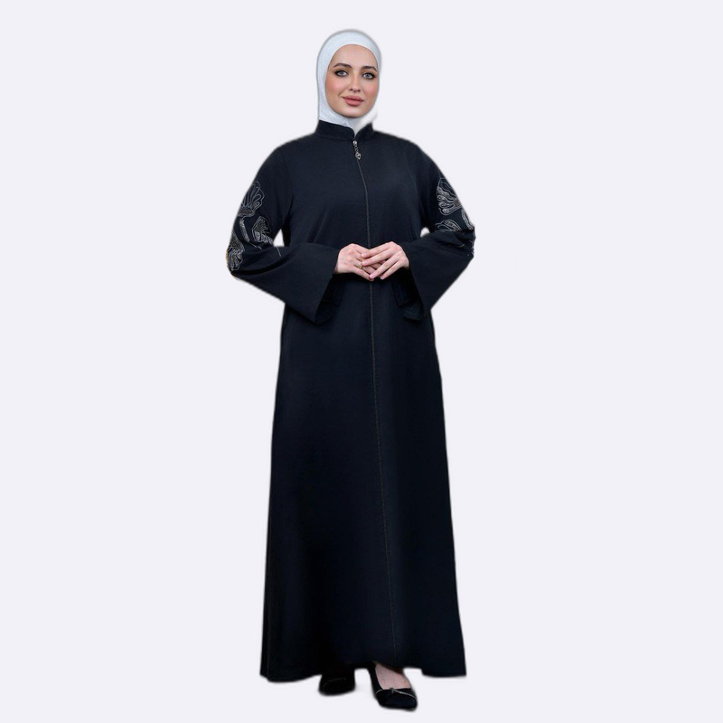 عباءة سوداء بتصميم أنيق ومحتشم، تتميز بتطريز رقيق على الأكمام، مثالية للارتداء اليومي أو المناسبات.