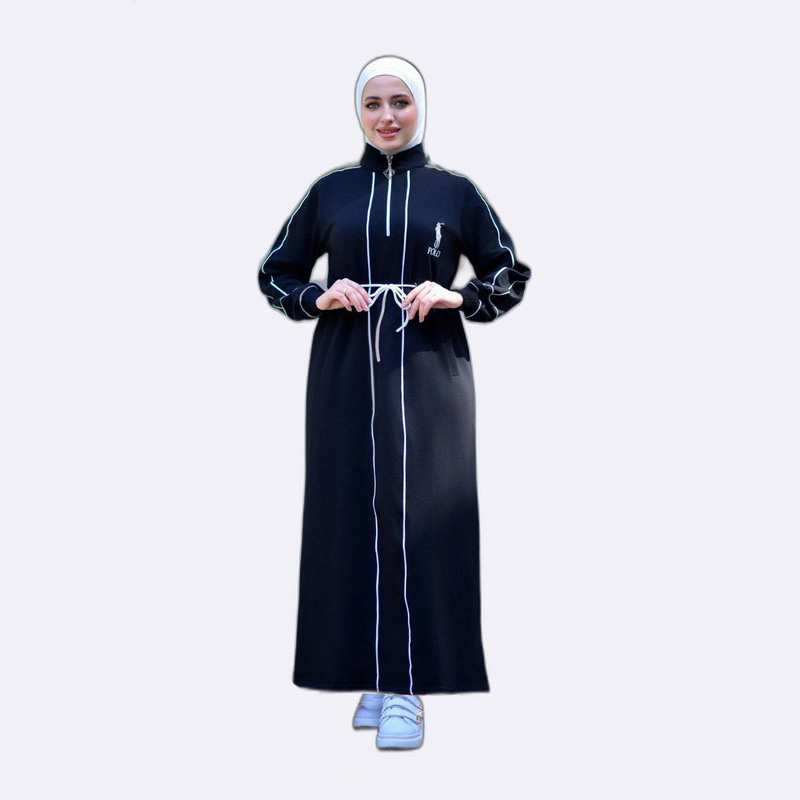 عباءة سوداء بتصميم رياضي وعصري، تتميز بخطوط بيضاء على الأكمام والجانبين، مثالية للارتداء اليومي الأنيق والمريح.