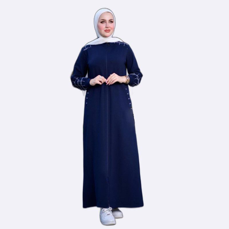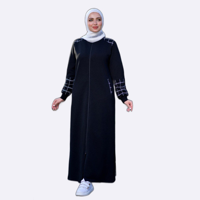 عباءة عملية بتصميم عصري وأنيق، متوفرة بألوان مثل الأسود والكحلي، وتتميز بجيوب عملية وزخرفة على الأكمام.