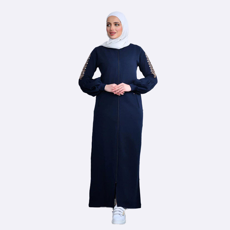 عباءة كحلية أنيقة، تتميز بجيوب جانبية وتطريز ذهبي على الأكمام، مما يمنحها لمسة من الفخامة والرقي، وتناسب الإطلالات اليومية والخاصة.