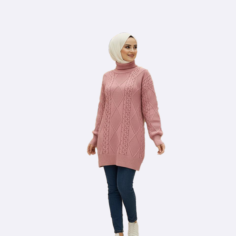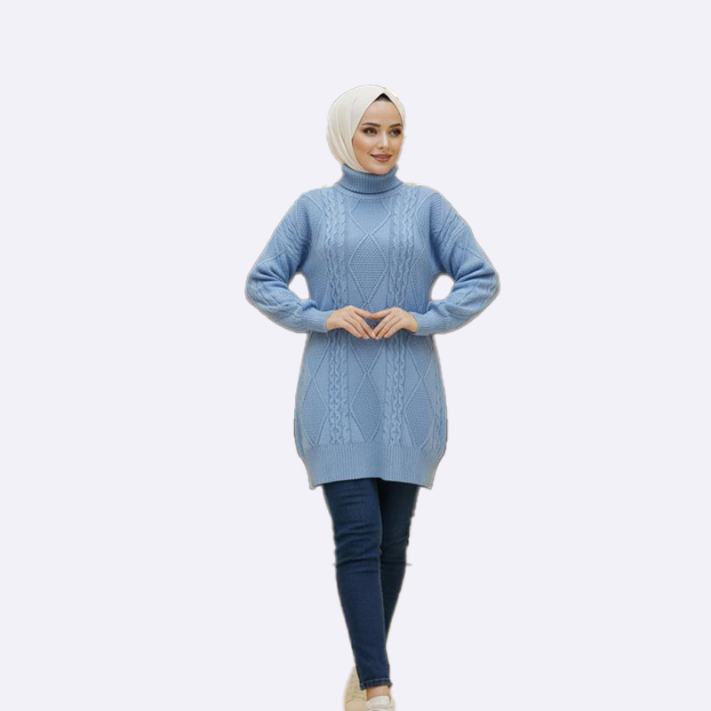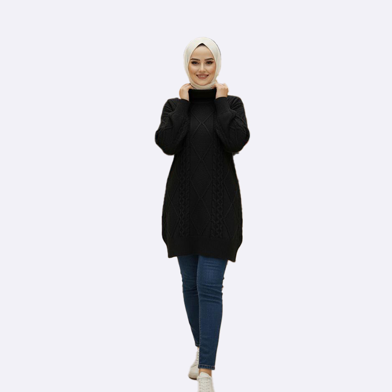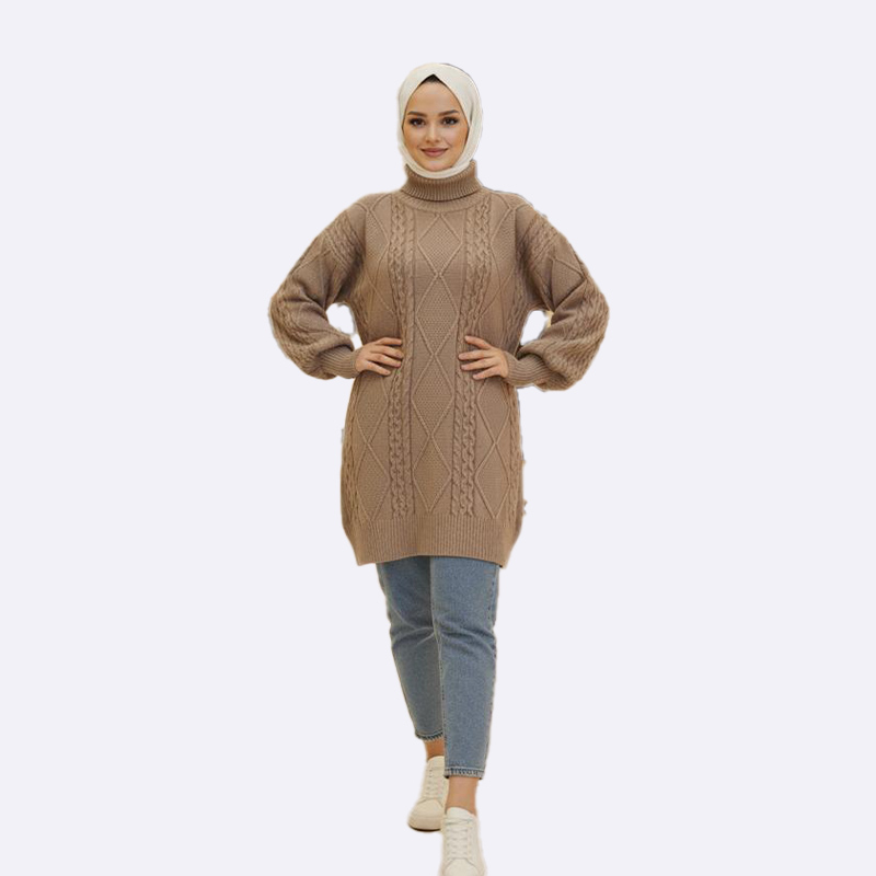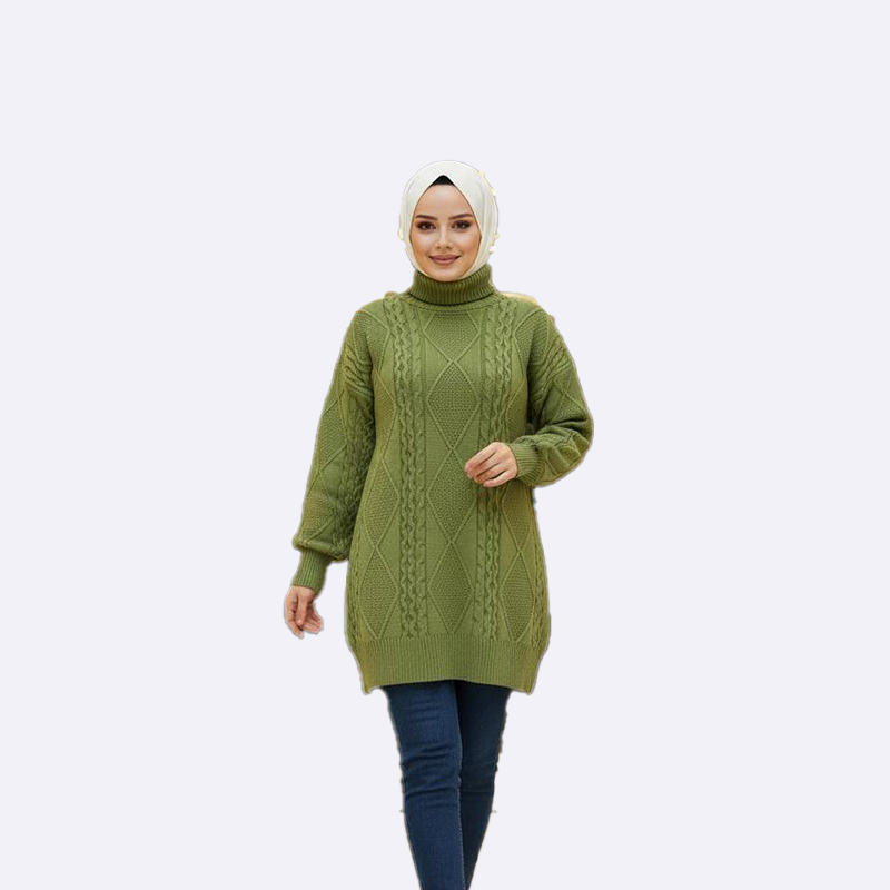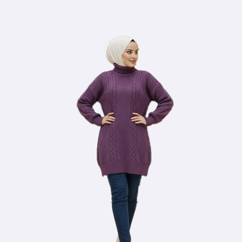 كنزة صوفية شتوية دافئة واسعة (Free Size)، تتميز بتصميم ضفائر بارز على كامل النسيج وبياقة عالية مريحة.
