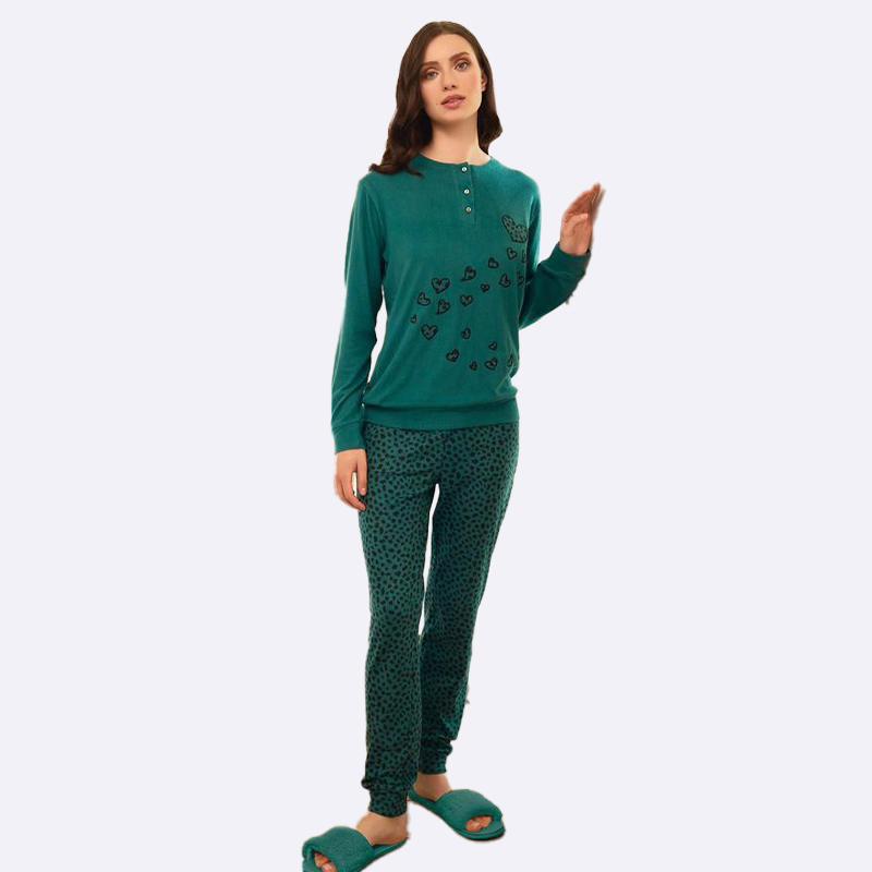 طقم بيجامة نسائية دافئ من المخمل الصوف التركي، يتميز بقطعة علوية مزينة بطباعة مرحة وسروال بنقشة متكررة، مثالية للراحة في المنزل.