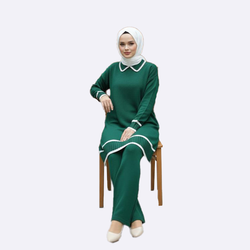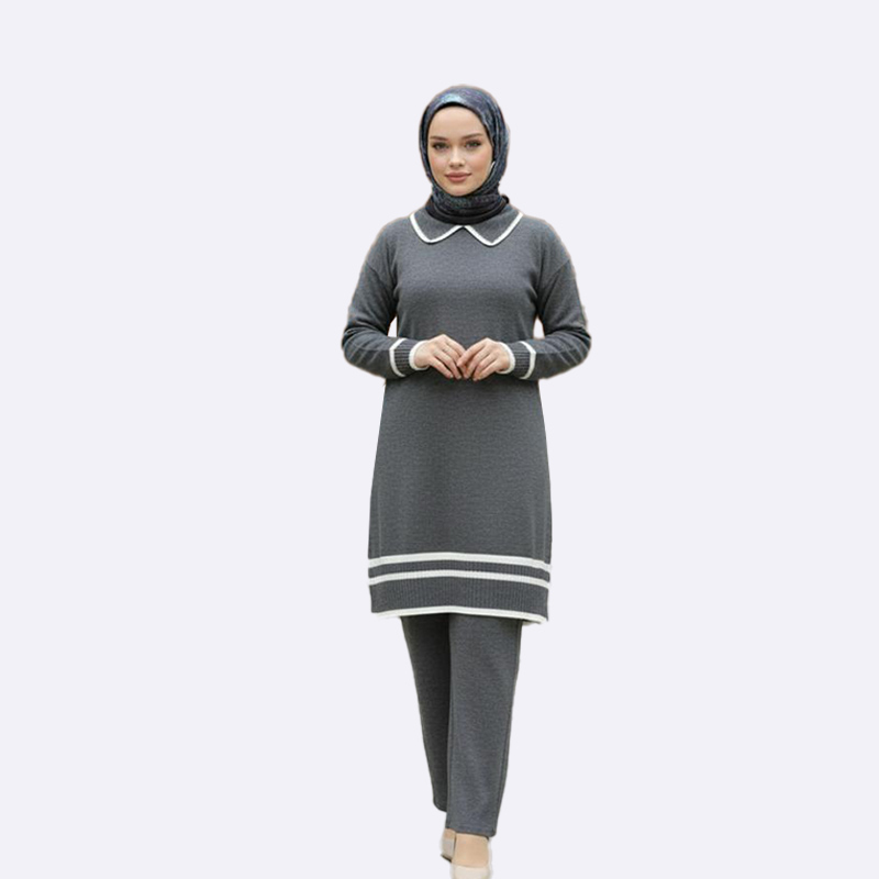 طقم شتوي من التريكو بقصة واسعة (Free Size)، يتكون من تونيك بطول 85 سم مزود بياقة بيتر بان وأطراف متباينة، وسروال واسع ومريح.