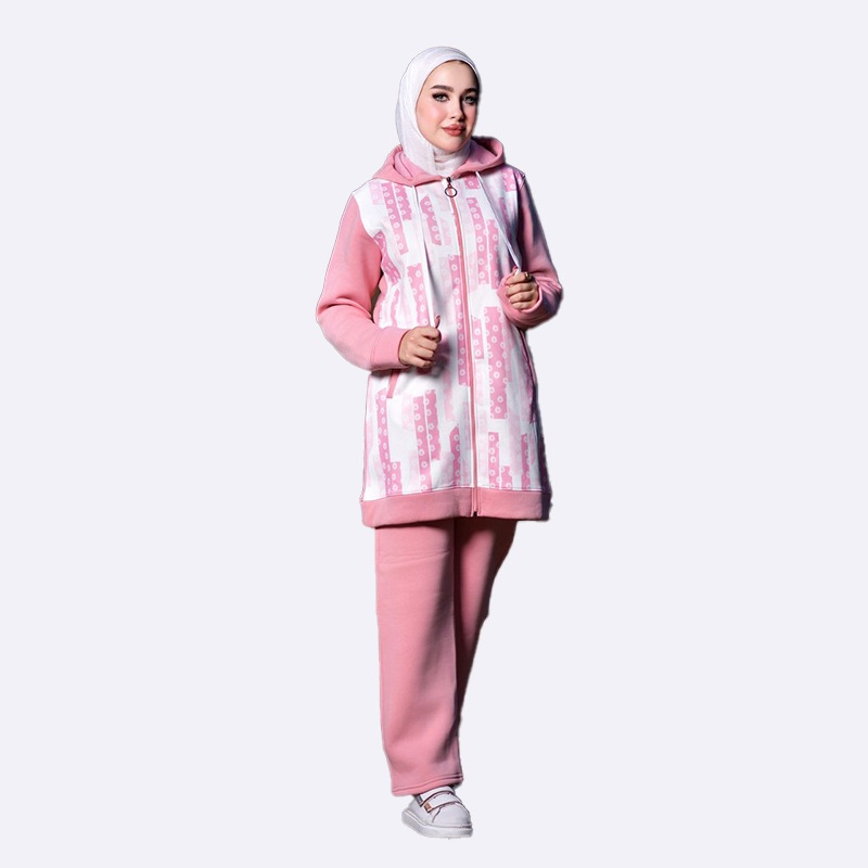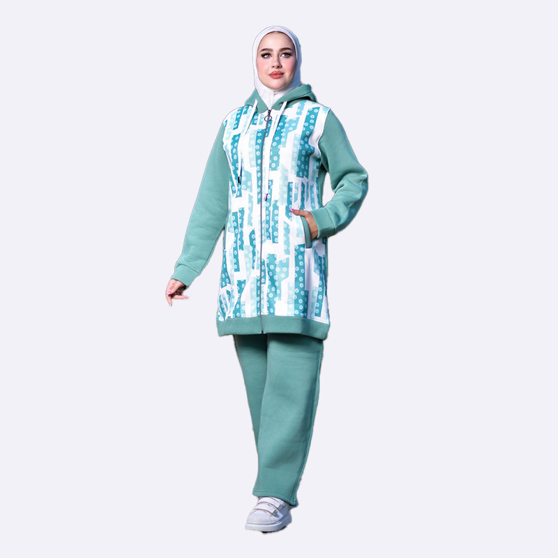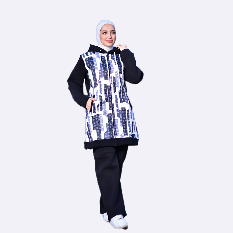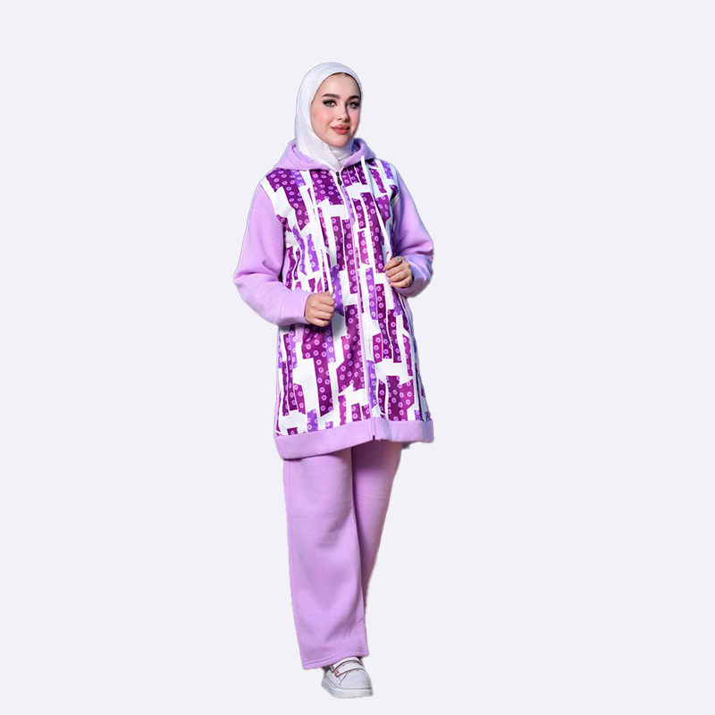 طقم رياضي شتوي من الفليس الدافئ، يتميز بقطعة علوية ذات تصميم سترة أمامية بسحاب ونقوش عصرية، مع أكمام وسروال بلون سادة.