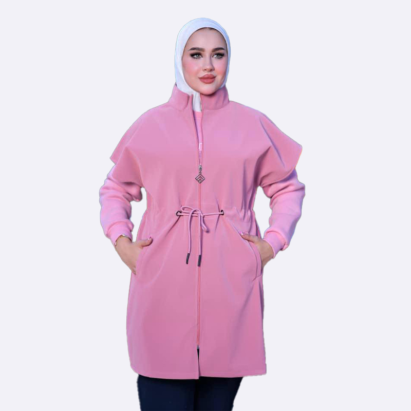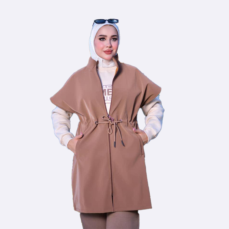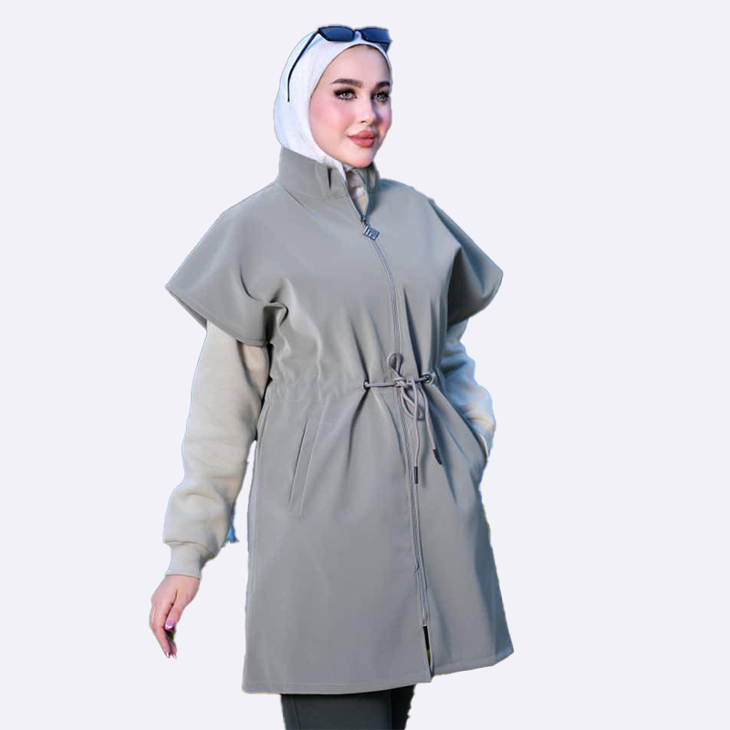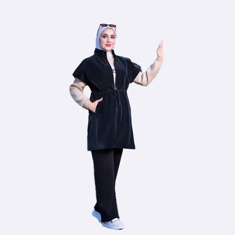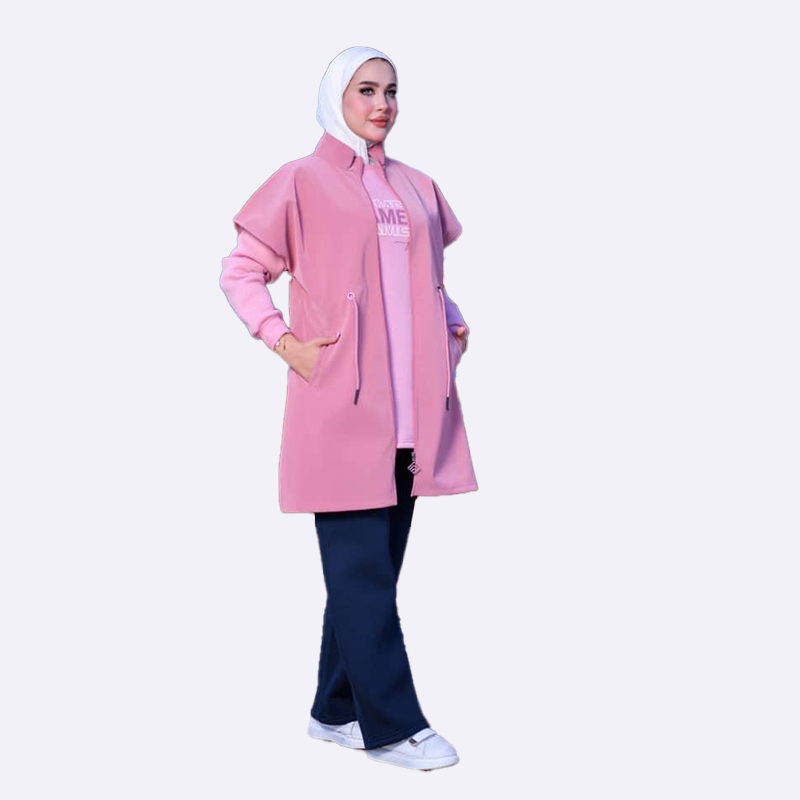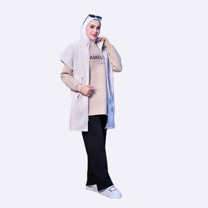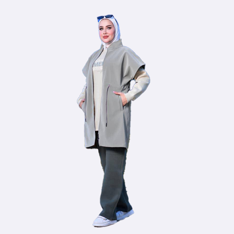 طقم شتوي مكون من ثلاث قطع، يتضمن سويت شيرت فليس وسروال فضفاض، بالإضافة إلى جاكيت خارجي طويل بدون أكمام مصنوع من مادة تشبه الجلد (أو القماش السميك).
