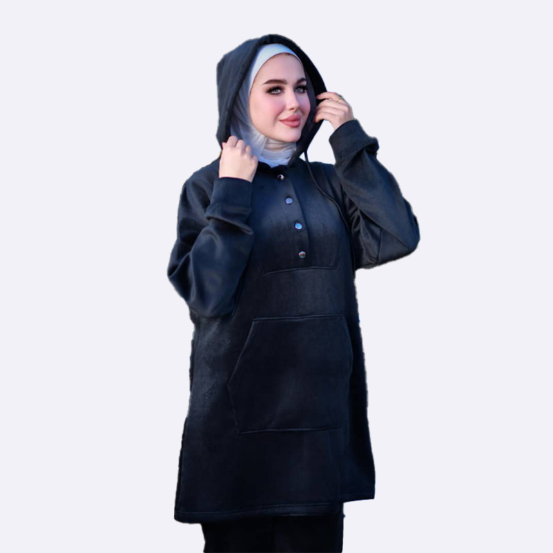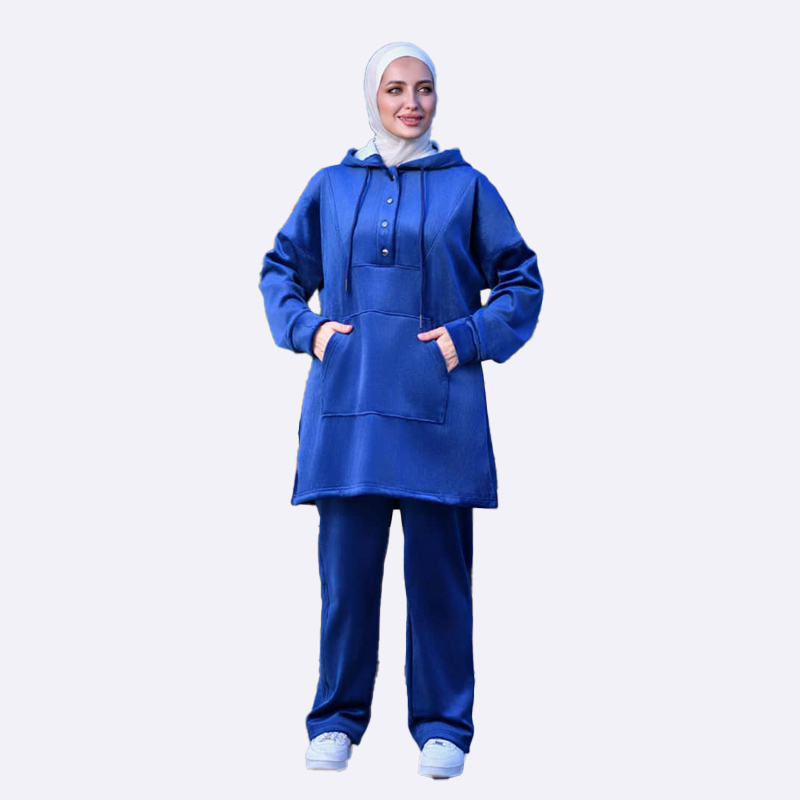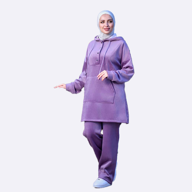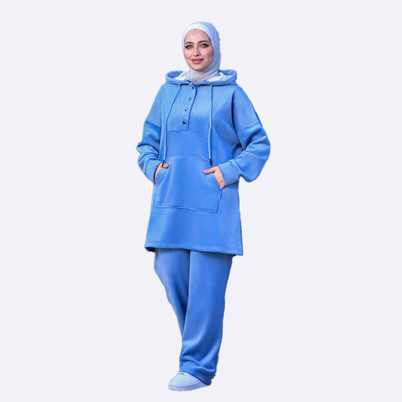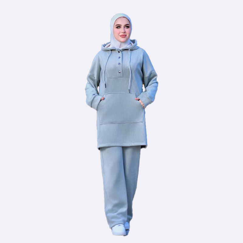 طقم شتوي دافئ ومبطن، يتميز بقطعة علوية طويلة بغطاء رأس (هودي) وجيب أمامي كبير، مع أزرار عند الرقبة، وسروال واسع ومريح.