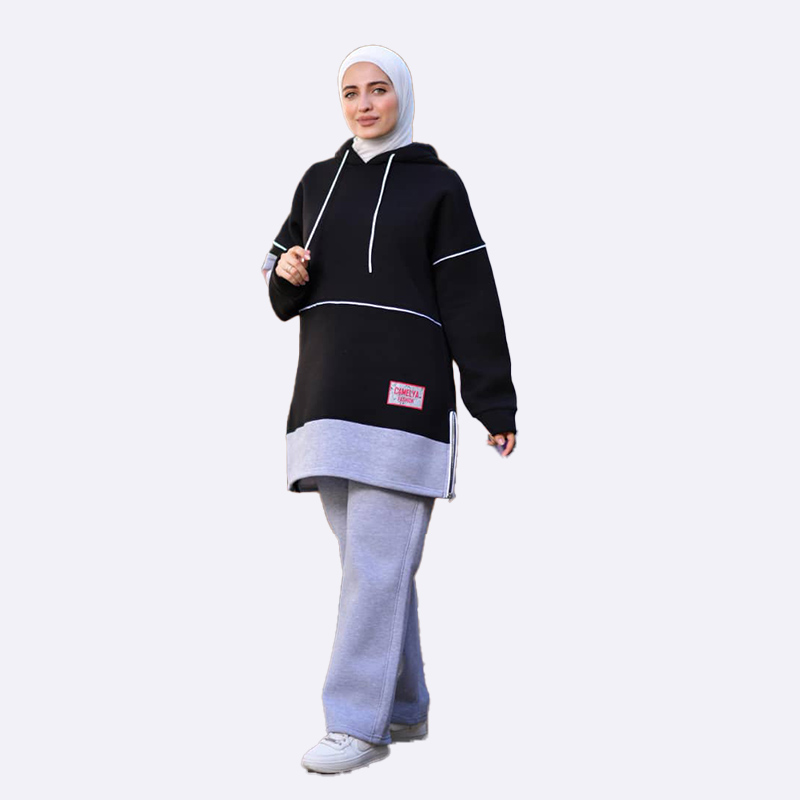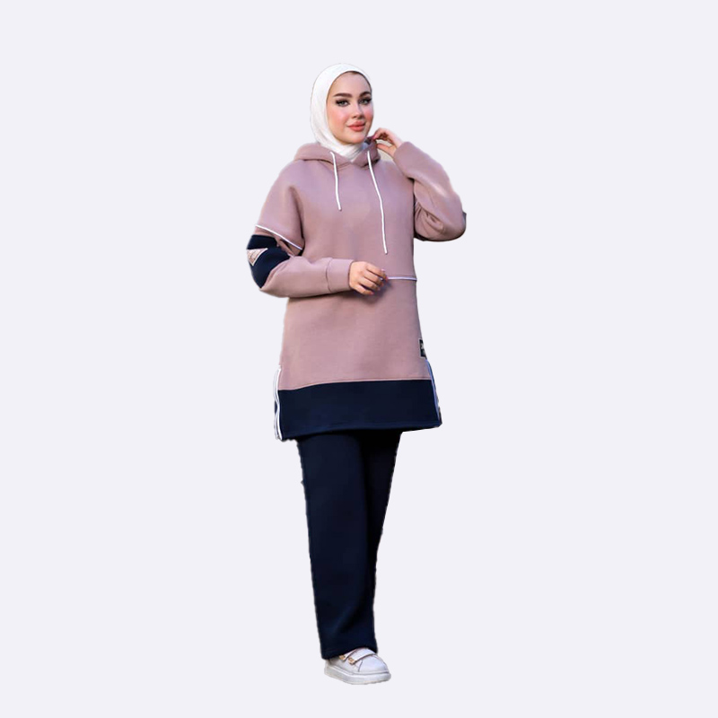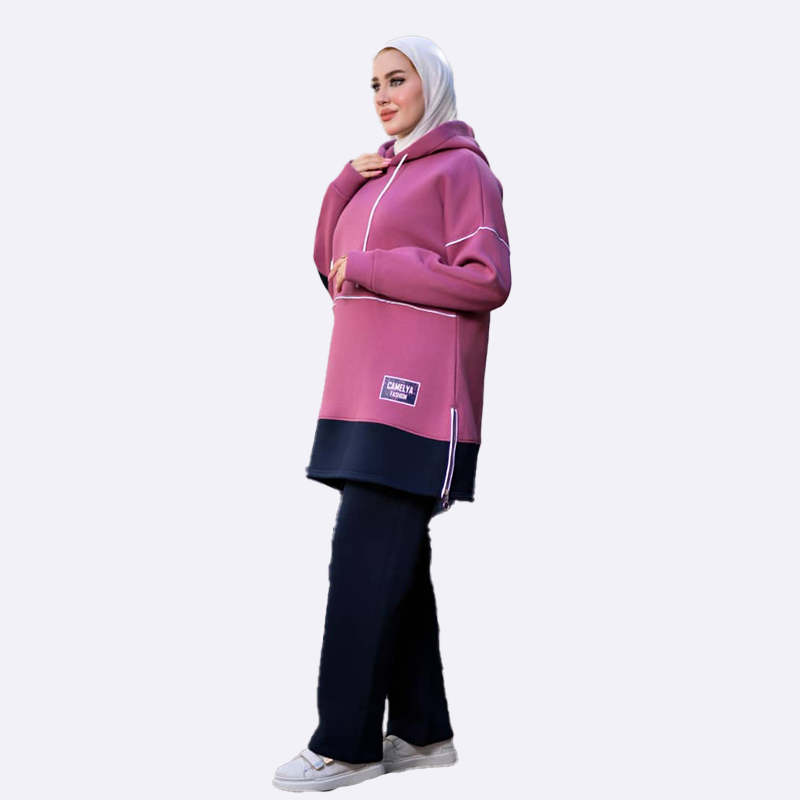 طقم رياضي مريح من قماش الفليس التركي، يتميز بكنزة بغطاء رأس طويلة ذات تصميم رياضي ومقسومة بلونين مع تفاصيل خطوط بيضاء، وسروال فضفاض سادة.