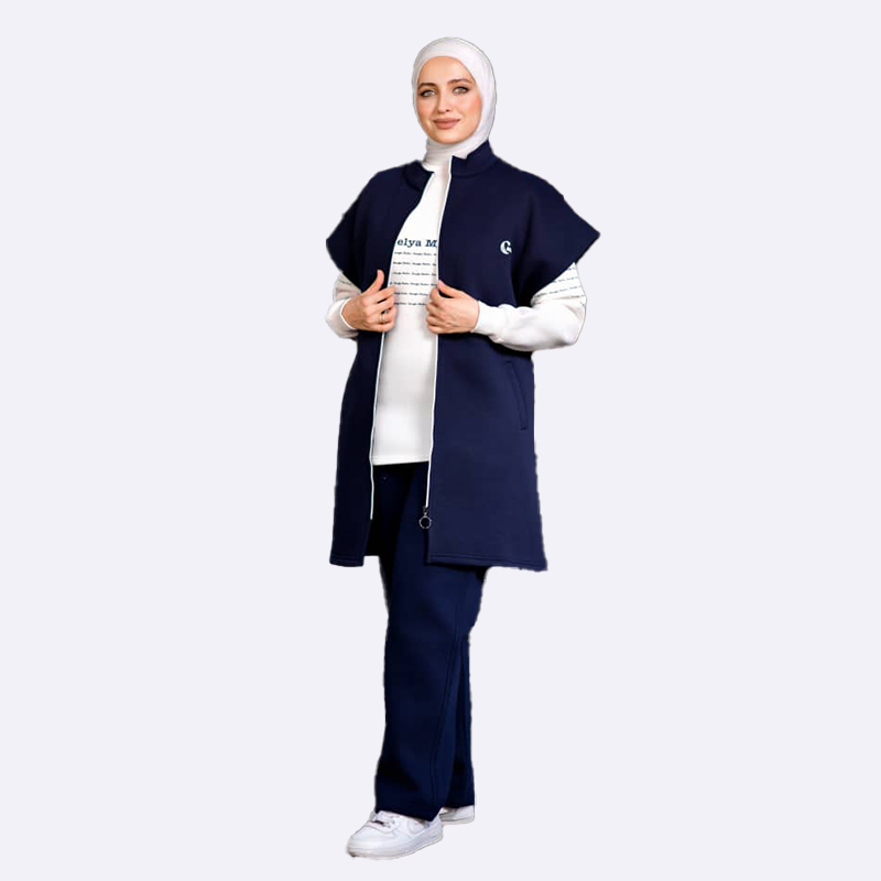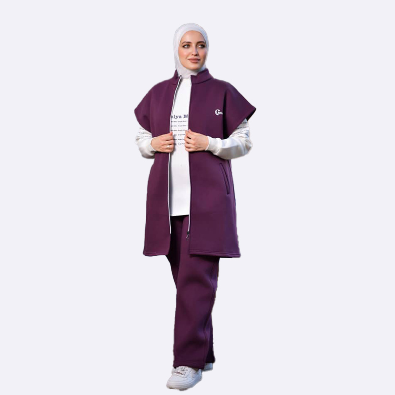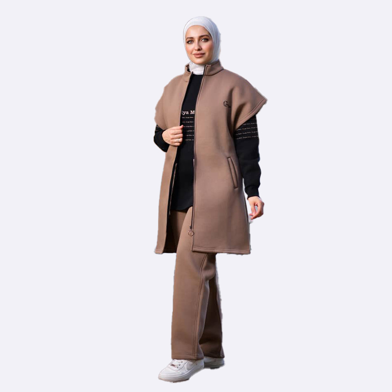 طقم شتوي مريح من ثلاث قطع، يتكون من كنزة داخلية وسروال من الفليس، بالإضافة إلى سترة خارجية طويلة بياقة عالية وبدون أكمام.