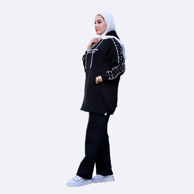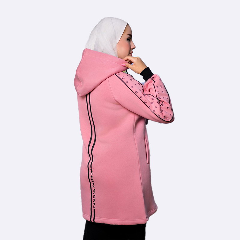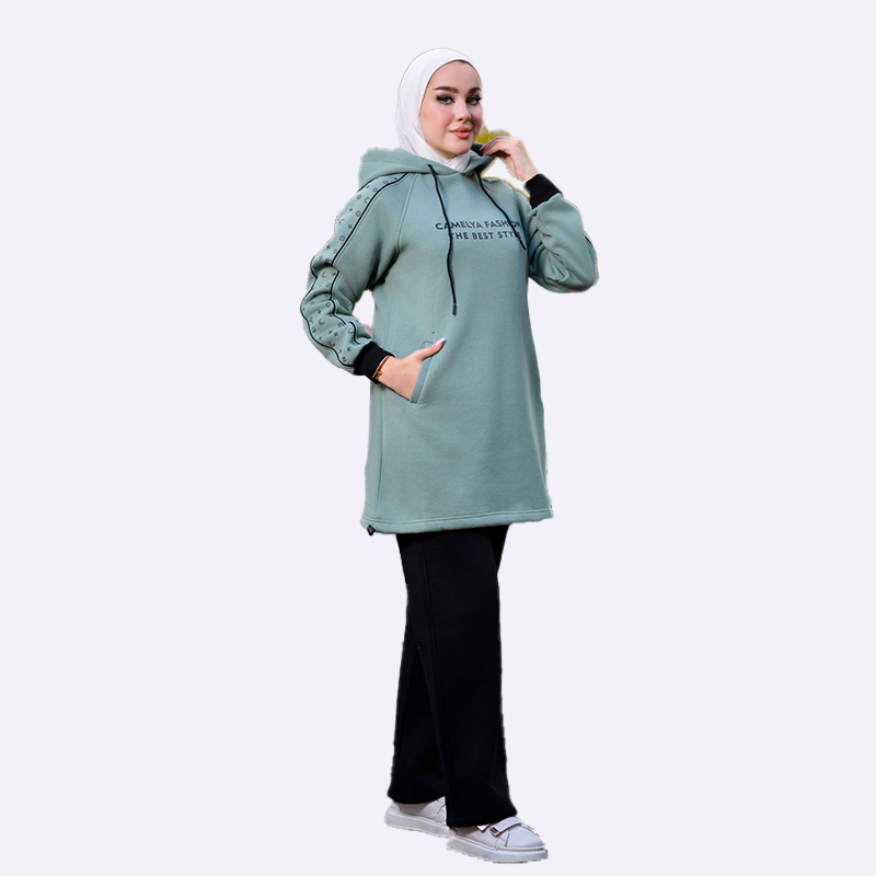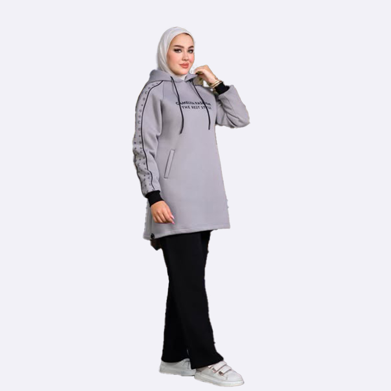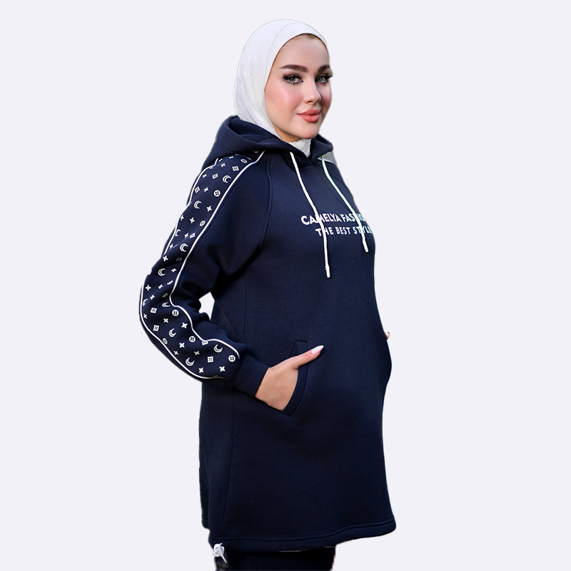 كنزة هودي رياضية طويلة (تونيك) من الفليس الدافئ، تتميز بغطاء للرأس وطباعة نصية على الصدر وطباعة زخرفية على طول الأكمام، مع جيب أمامي كبير.