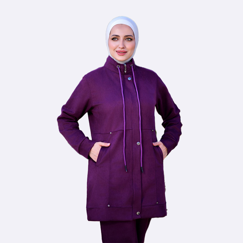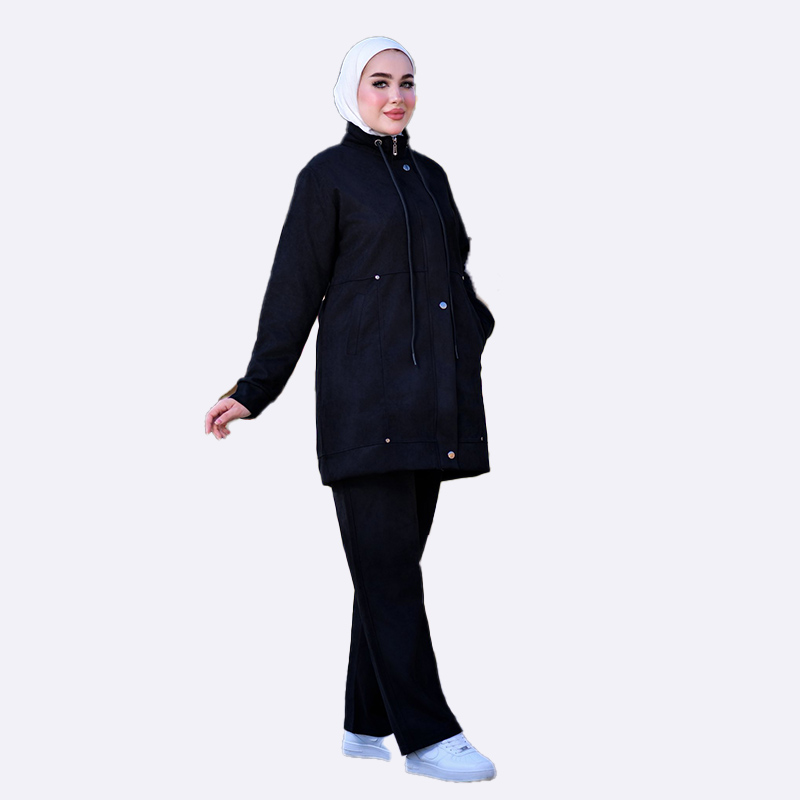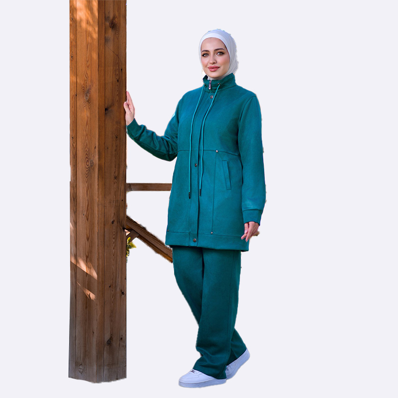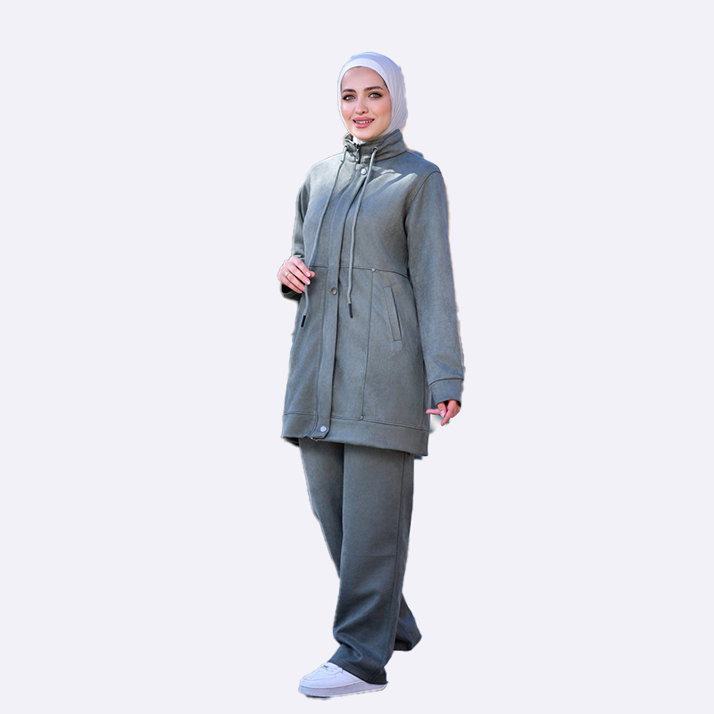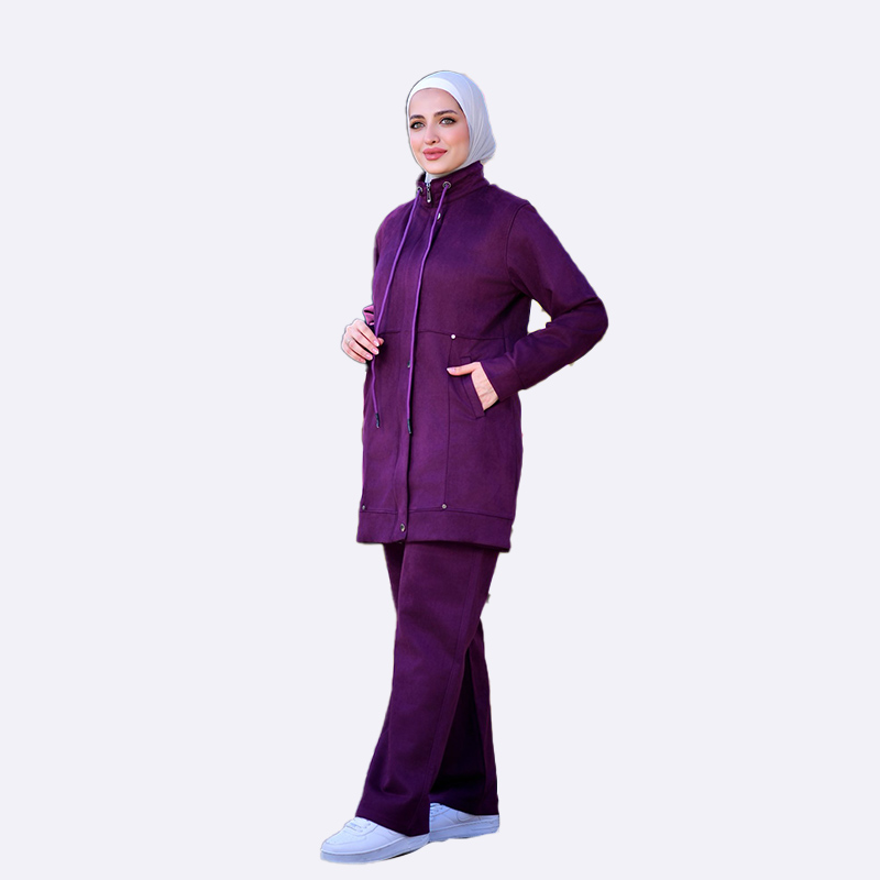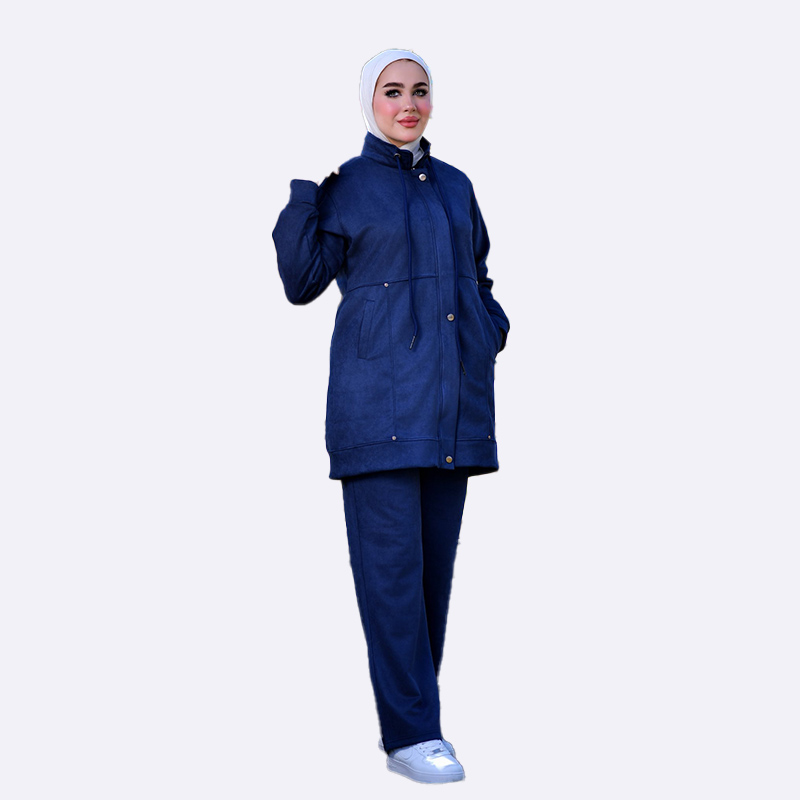 طقم شتوي دافئ وناعم مصنوع من قماش الشامواه، يتميز بقطعة علوية طويلة بسحاب أمامي وياقة مرتفعة قابلة للشد، وجيبين جانبيين، وسروال واسع.