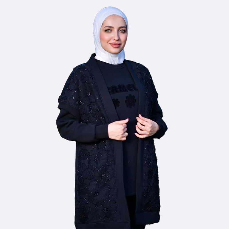 طقم دافئ من ثلاث قطع، يتكون من كنزة داخلية وسروال سادة، بالإضافة إلى كارديجان خارجي طويل ومفتوح مزين بنقوش مطرزة أو بارزة.