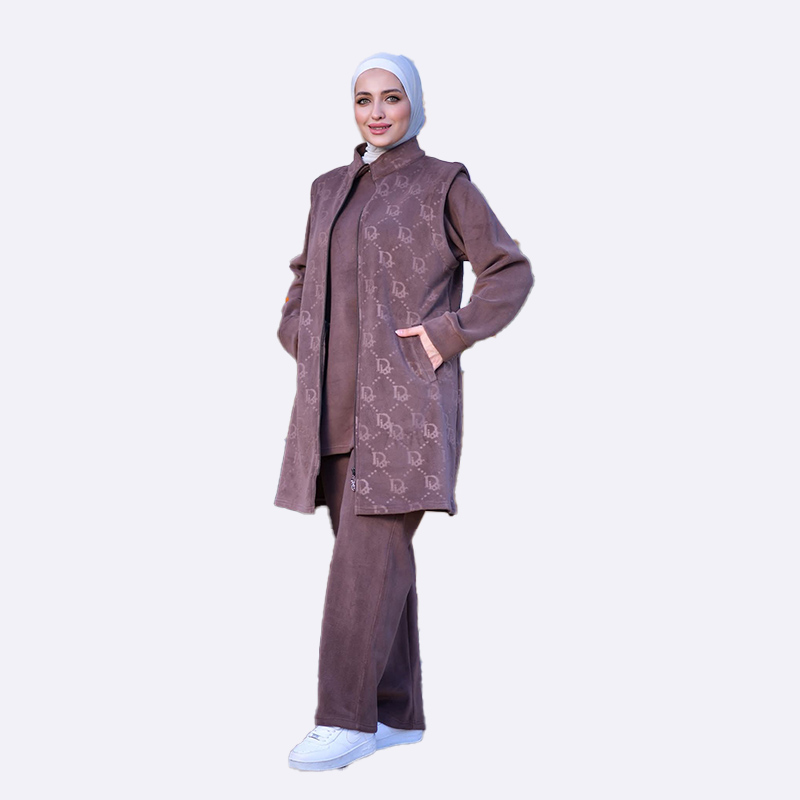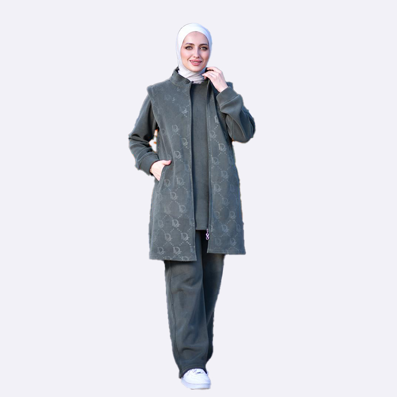 بجامة نسائية أنيقة مؤلفة من 3 قطع: كنزة داخلية مريحة، وبنطال واسع، مع فيست طويل بسحاب وجيوب أمامية لسهولة الاستخدام. قماش ناعم ومريح مناسب للارتداء اليومي.