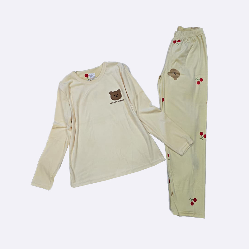 طقم نوم ناعم من المخمل يمنح راحة فائقة طوال الليل بتصميم لطيف وإحساس دافئ ومريح.