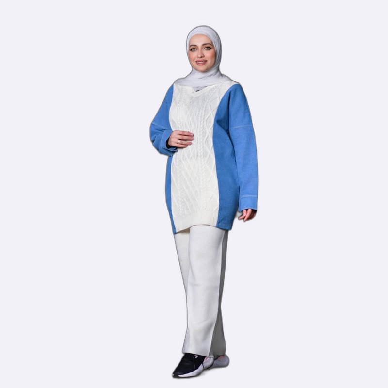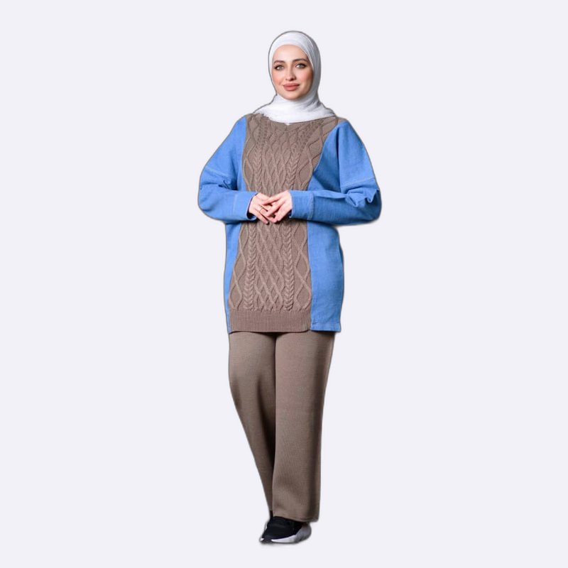 طقم شتوي محتشم وعصري يتألف من كنزة طويلة تتميز بقلب من نسيج التريكو بنقشة الضفائر مع بنطال واسع ومريح من نفس الخامة المحبوكة.