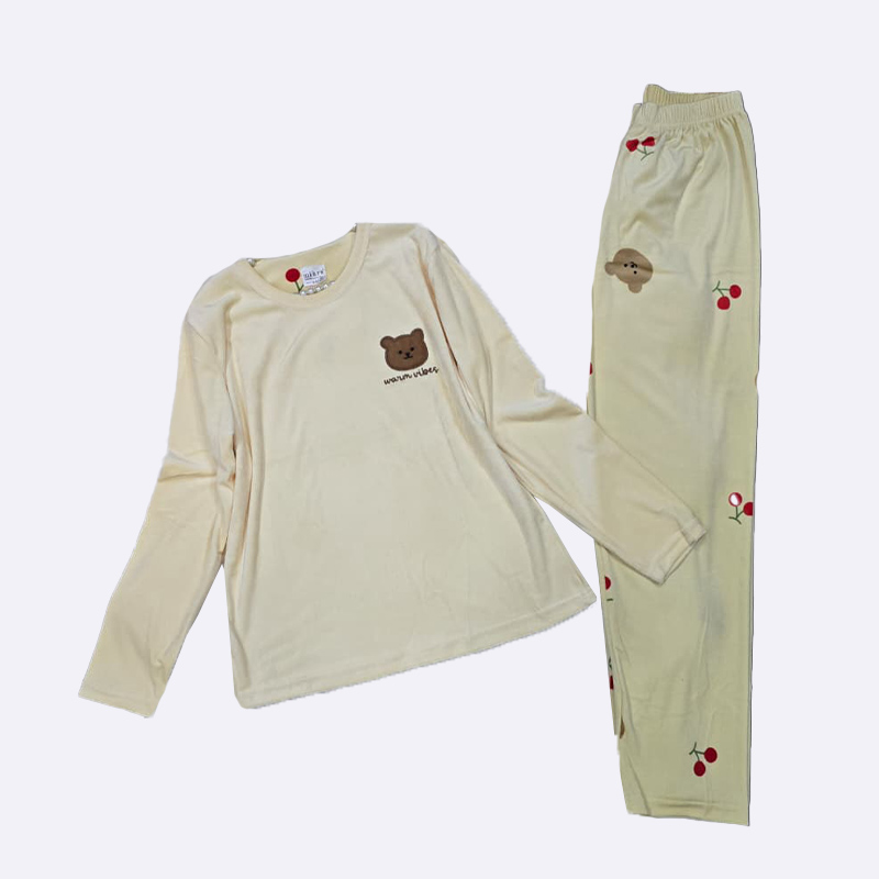 طقم قطني ناعم مريح يتكون من قطعتين بأكمام طويلة، مزين بطبعات لطيفة وتصميم يمنح الدفء والاسترخاء.