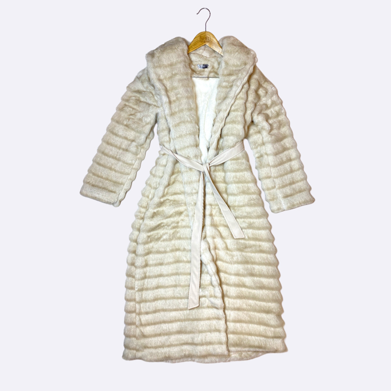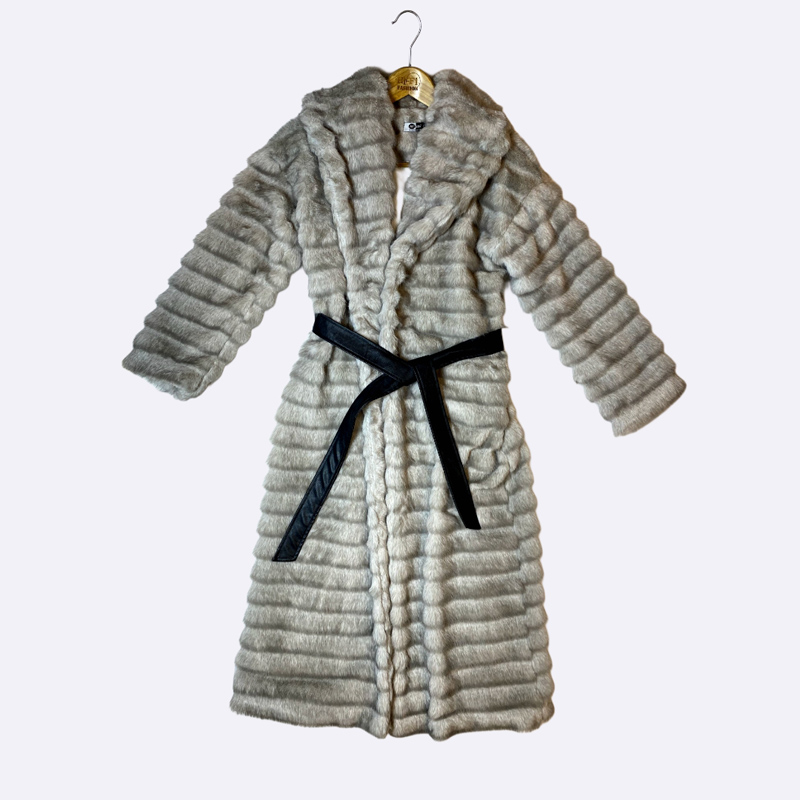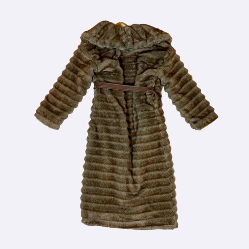 معطف نسائي شتوي طويل ودافئ من الفرو الصناعي البني المخطط أفقيًا، بياقة عريضة وحزام من الجلد الصناعي للخصر