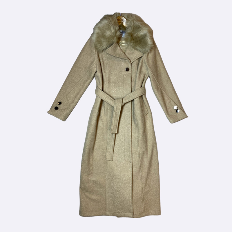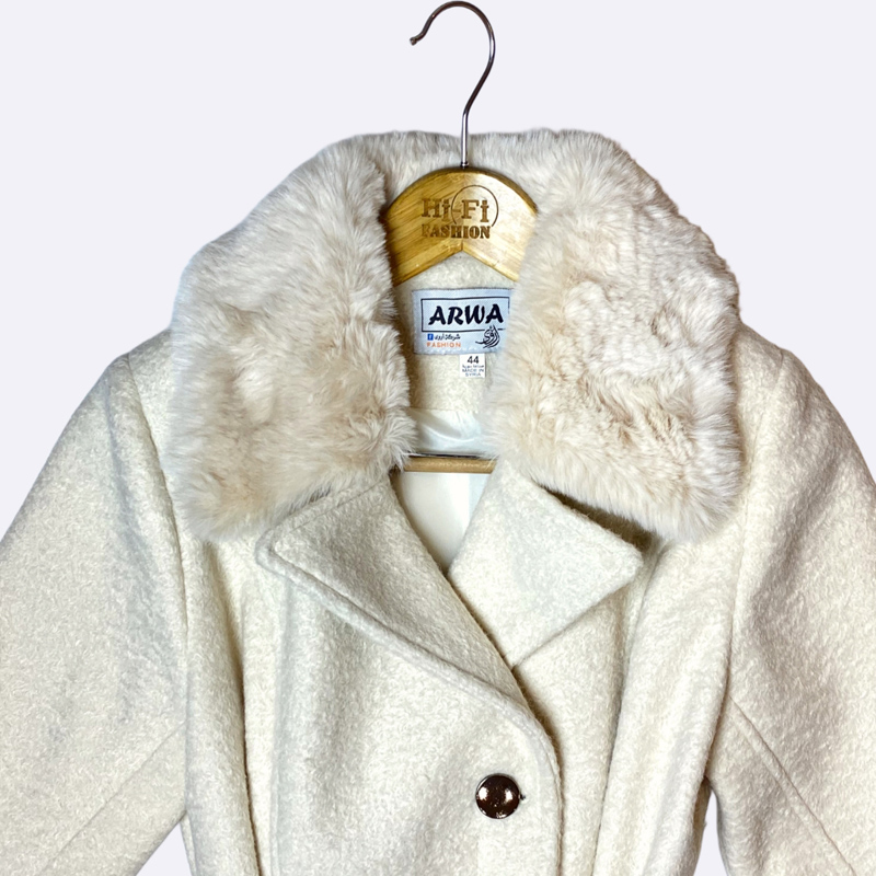 مانطو شتوي نسائي طويل من قماش الجوخ (الكشمير/الصوف) باللون الأبيض العاجي، يتميز بياقة من الفرو الفاتح وحزام عريض للخصر وأزرار بنية داكنة