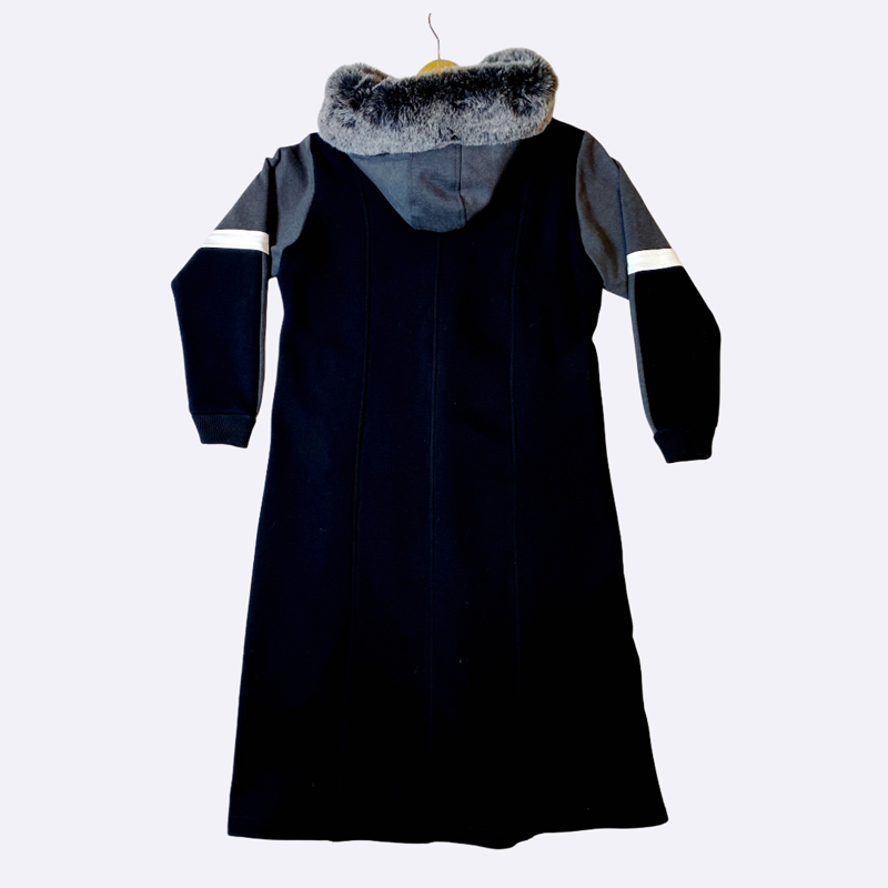 مانطو شتوي طويل ودافئ من خامة القطن الفليس، بلونين (أسود ورمادي)، مزود بسحاب أمامي كامل، وغطاء رأس مع ياقة من الفرو، وخطوط عاكسة للضوء.