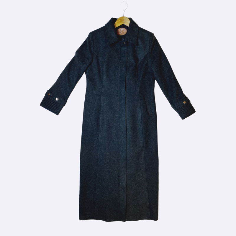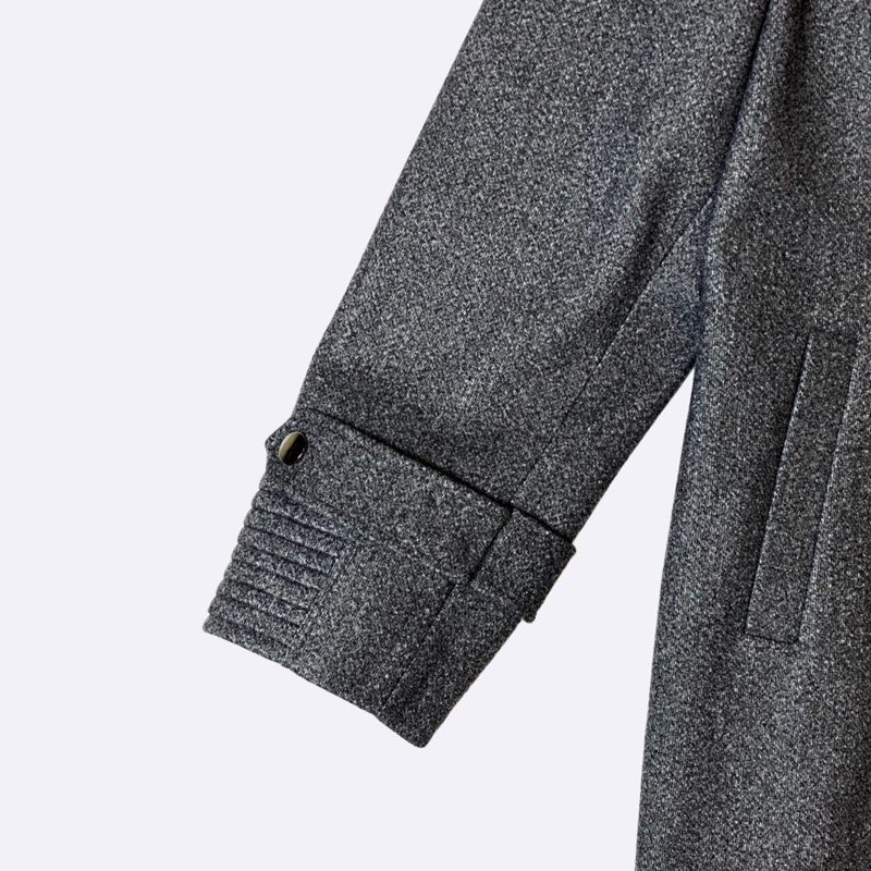 مانطو شتوي نسائي طويل كلاسيكي من قماش الجوخ السميك بلون رمادي داكن، يتميز بنقشة متعرجة أو خطوط دقيقة وأكمام بأساور عريضة.