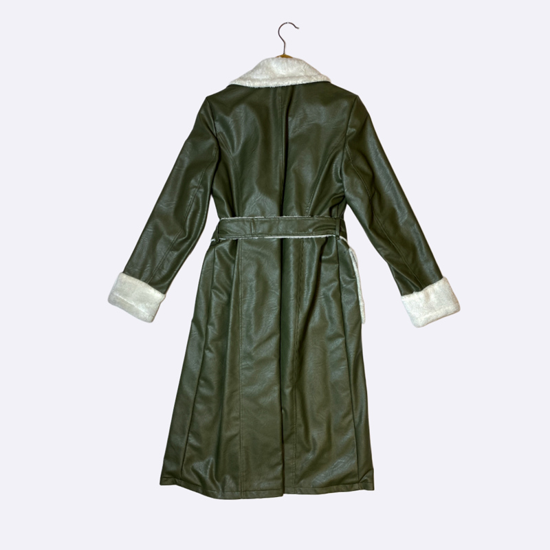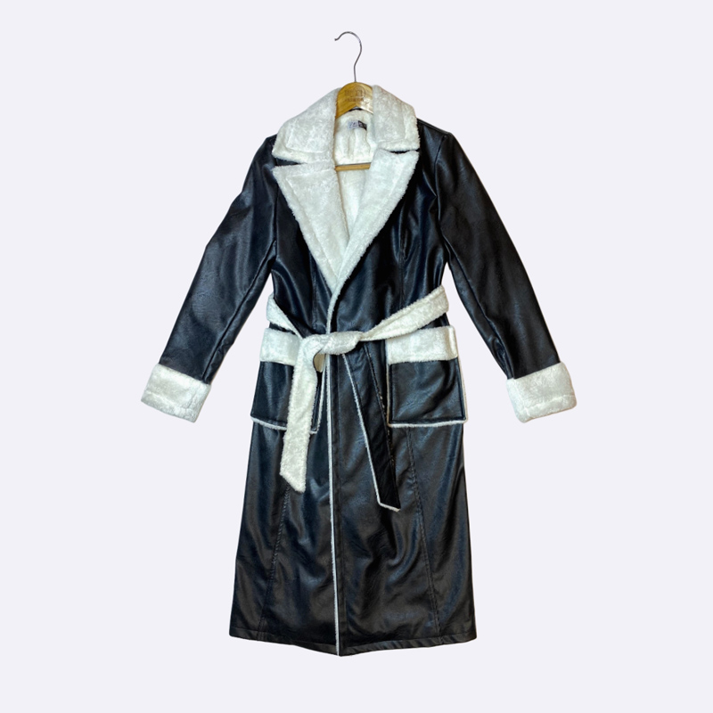 مانطو شتوي نسائي طويل مصنوع من الجلد الصناعي، يتميز ببطانة وكسوة خارجية عند الياقة والأساور من الفرو الدافئ، ومزود بحزام عريض للخصر.