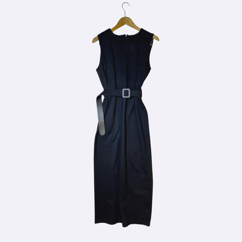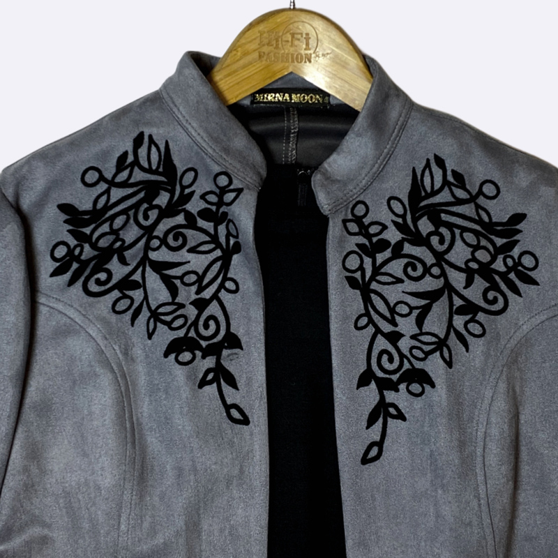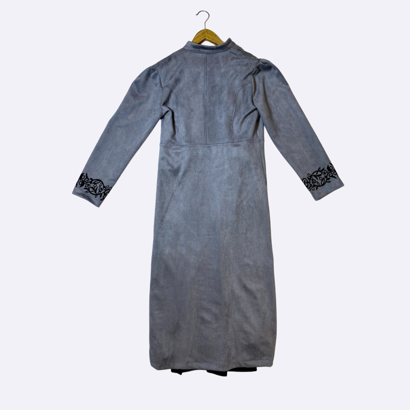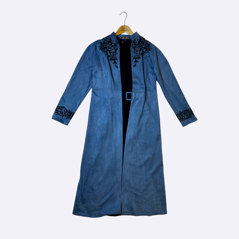 طقم نسائي طويل من قطعتين (مانطو مفتوح داخله قطعة)، المانطو الخارجي من الشامواه الصناعي بياقة مرتفعة وتطريز على الصدر والأكمام وحزام ب buckle.