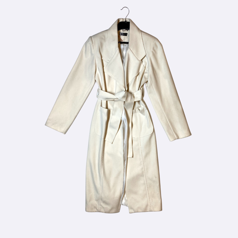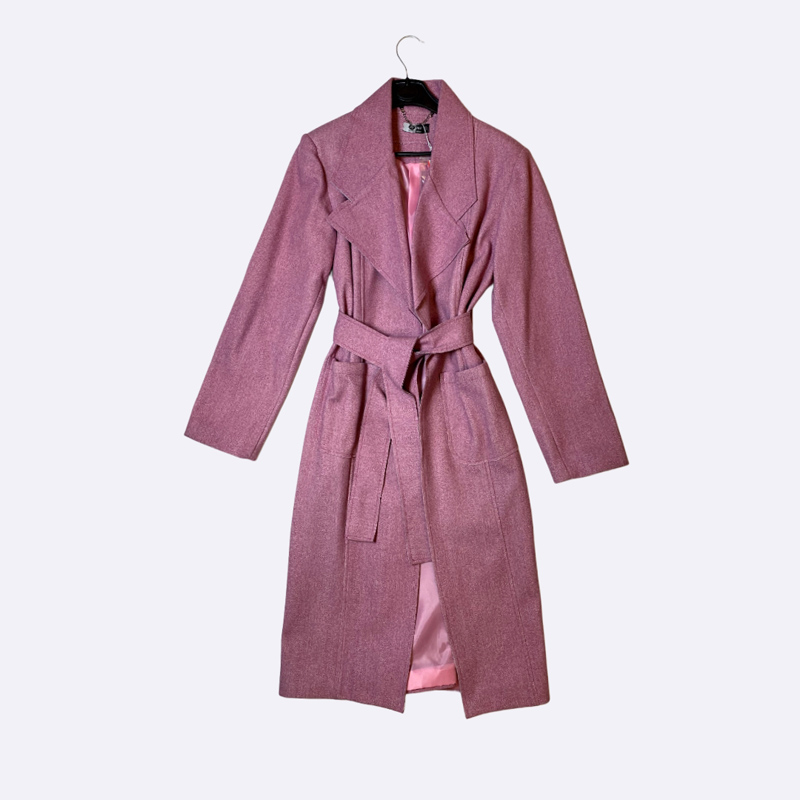 معطف نسائي شتوي كلاسيكي بطول متوسط، مصنوع من قماش دافئ وثقيل، يتميز بقصة اللف (Wrap) وبياقة عريضة وحزام قماش عريض للخصر.