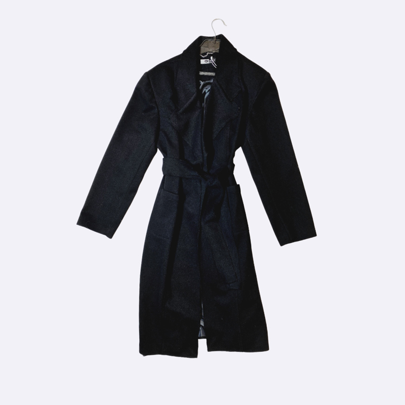 معطف شتوي نسائي متوسط الطول من قماش دافئ، بتصميم مستوحى من معطف الترنش، يتميز بياقة عريضة وحزام للخصر بأبزيم معدني، وتفاصيل إبزيم عند الأساور والياقة.