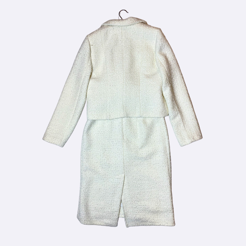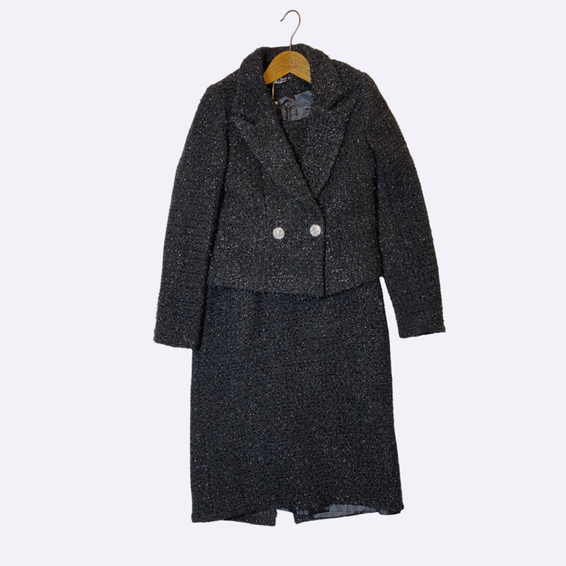 طقم نسائي أنيق مكوّن من جاكيت قصير بتصميم كلاسيكي وتنورة مستقيمة، مصنوع من قماش التويد الفاخر ليمنحك إطلالة راقية ومناسبة للمناسبات الرسمية أو الإطلالات اليومية الراقية.