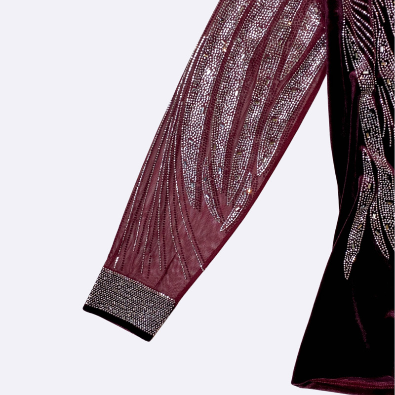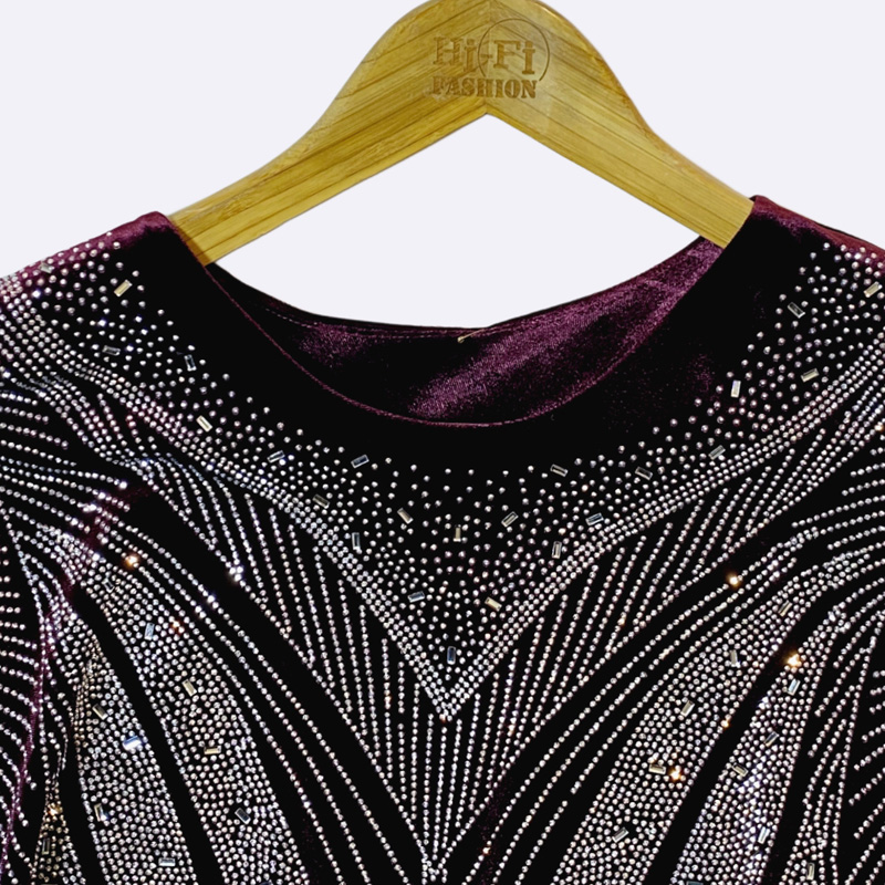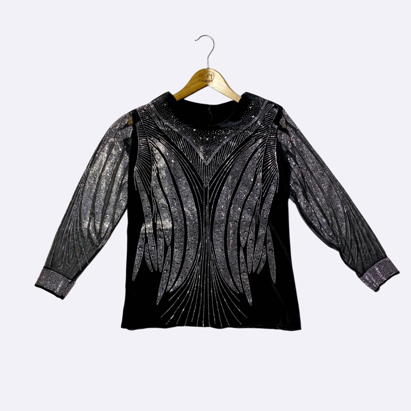 توب سهرة أنيق بتصميم مخملي مع أكمام شفافة وتفاصيل لامعة فخمة، يمنح إطلالة راقية ومثالية للمناسبات المسائية والاحتفالات.