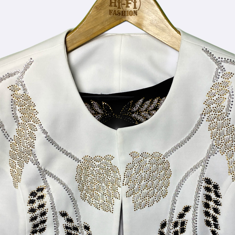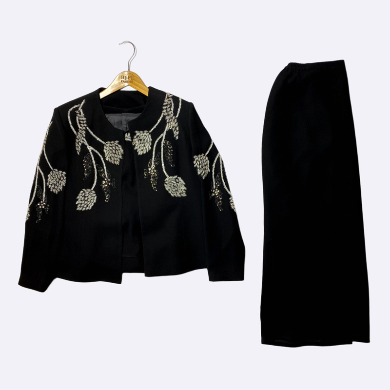 طقم سهرة راقٍ يتكون من جاكيت مزخرف بتطريزات فاخرة وتصميم كلاسيكي، مع تنورة طويلة تمنح إطلالة أنثوية مميزة للمناسبات الرسمية والاحتفالات.