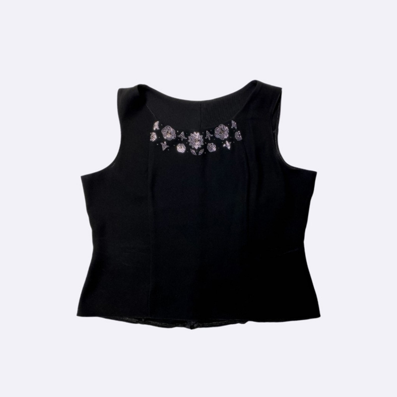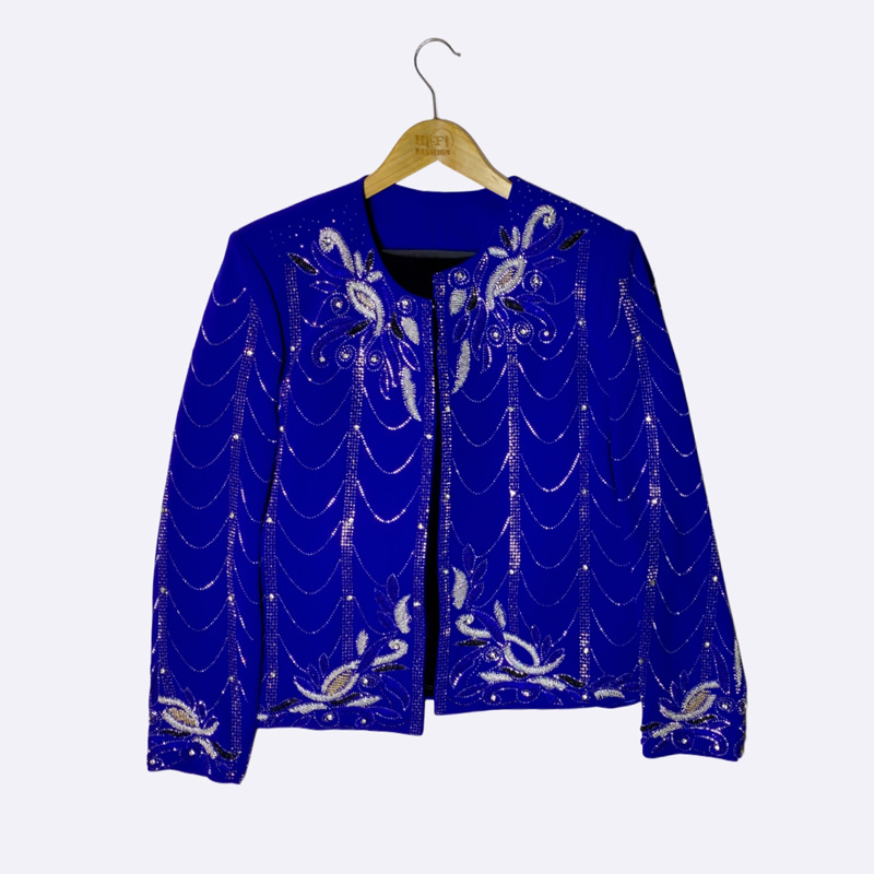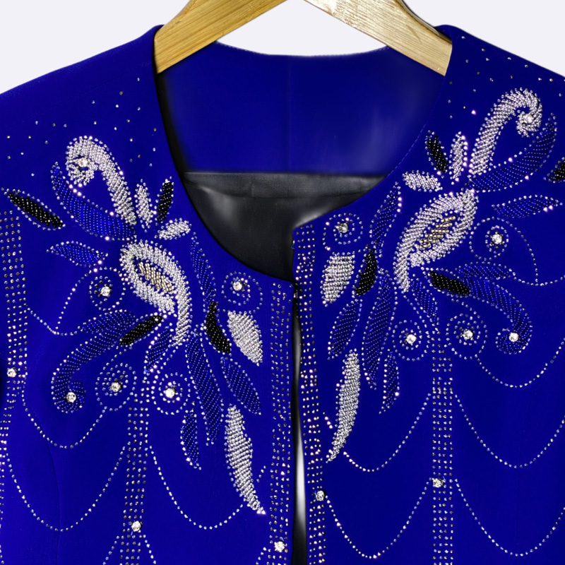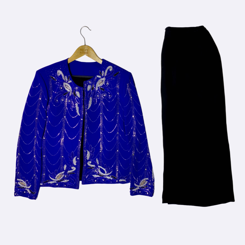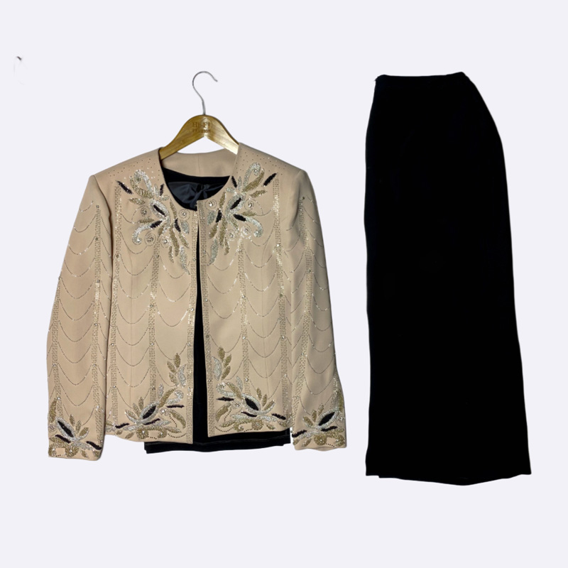 طقم أنيق مكوّن من جاكيت مزخرف بتطريزات لامعة بتصميم متدرج، مع تنورة طويلة كلاسيكية تناسب الإطلالات الرسمية والمناسبات الراقية.