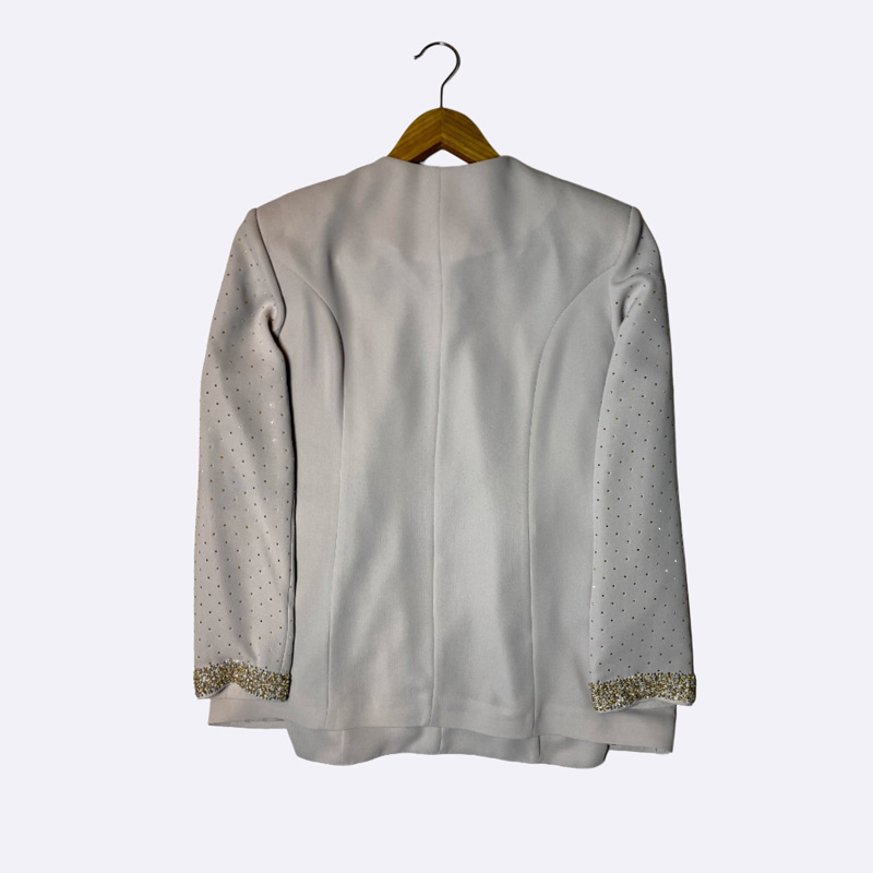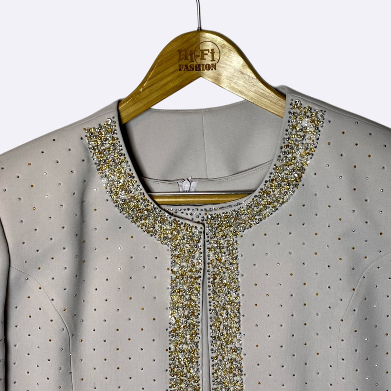 طقم رسمي أنيق يضم جاكيت بتصميم كلاسيكي مزين بتفاصيل لامعة على الأطراف والجيوب، مع بنطال مستقيم يمنح إطلالة راقية ومثالية للمناسبات الرسمية والزيارات الراقية.