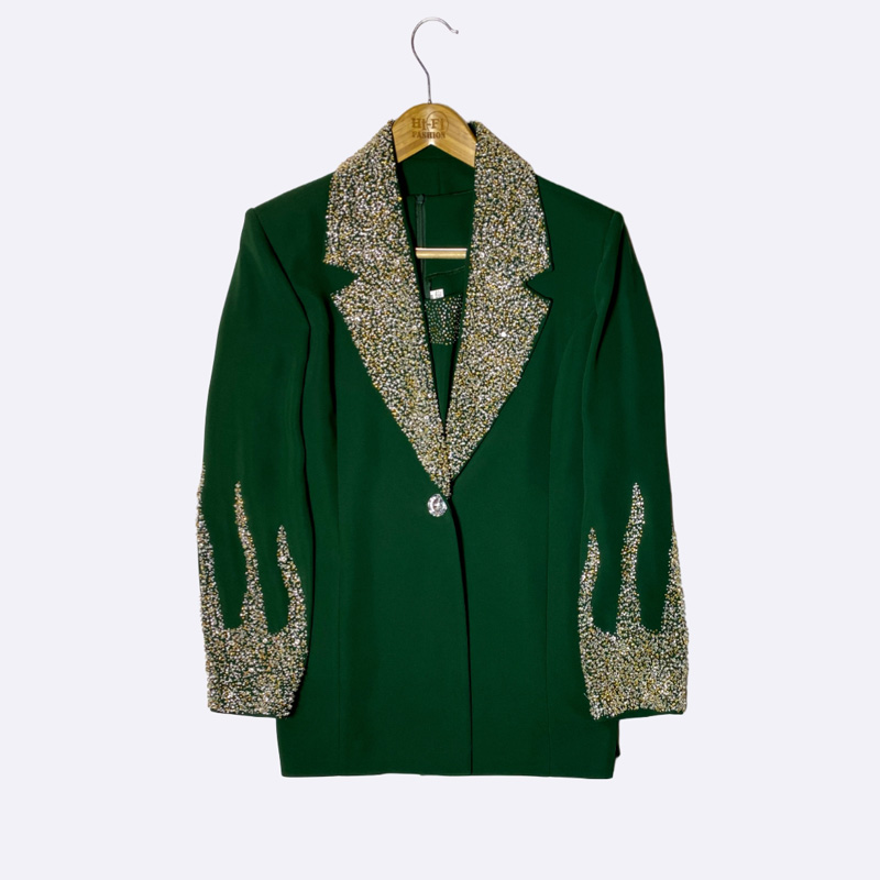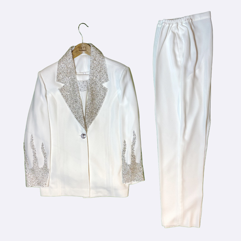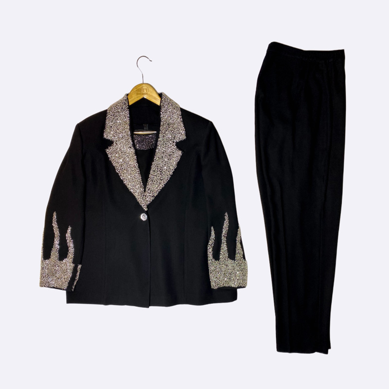 طقم رسمي أنيق يتضمن بليزر مزخرف بتفاصيل لامعة على الياقة والأكمام، مع بنطال مستقيم يمنح إطلالة راقية ومثالية للمناسبات الرسمية والزيارات الراقية.