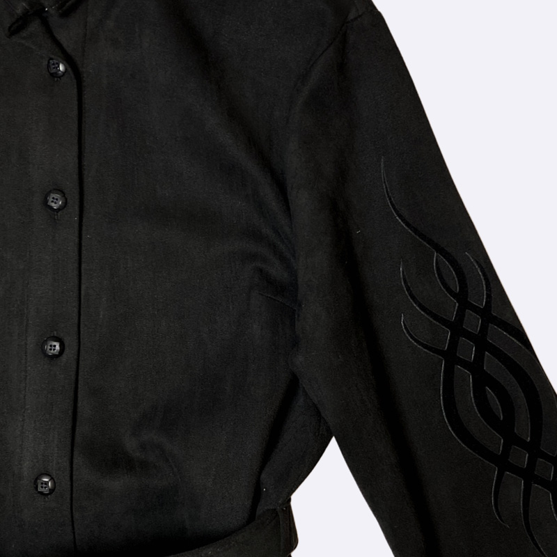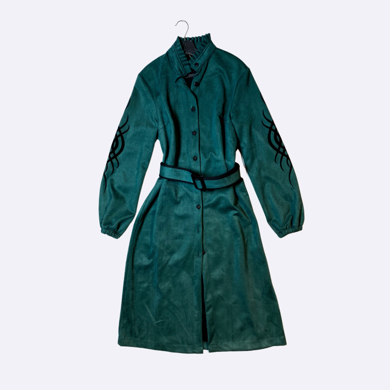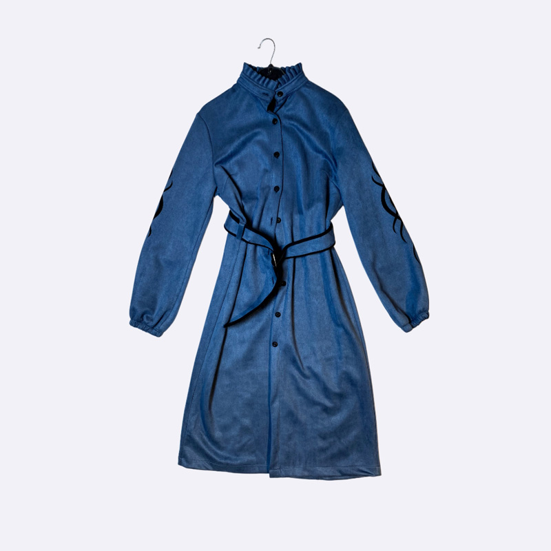 فستان ميدي أنيق بتصميم بأزرار كاملة وحزام خصر يبرز القوام، يتميز بأكمام طويلة مزودة بتفاصيل زخرفية لإطلالة كلاسيكية مناسبة للاستخدام اليومي والمناسبات البسيطة.