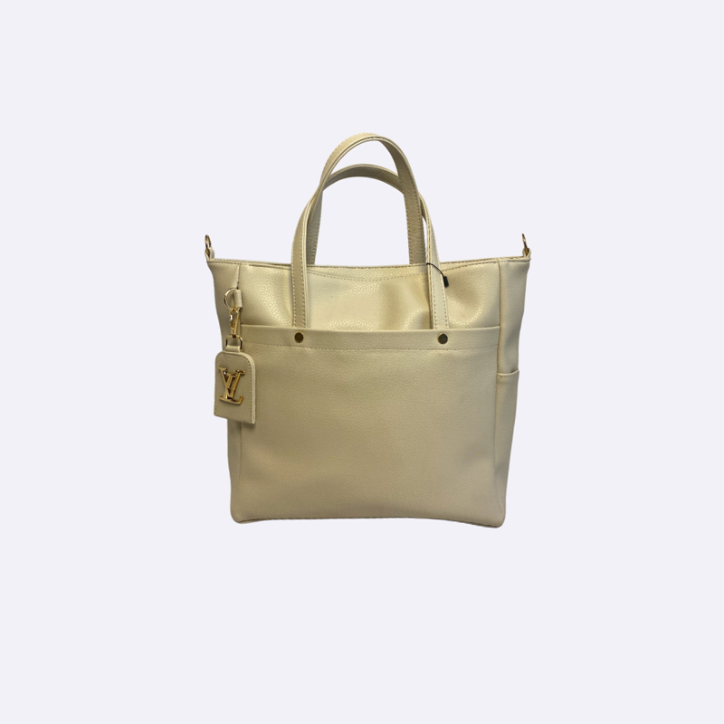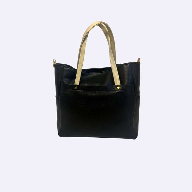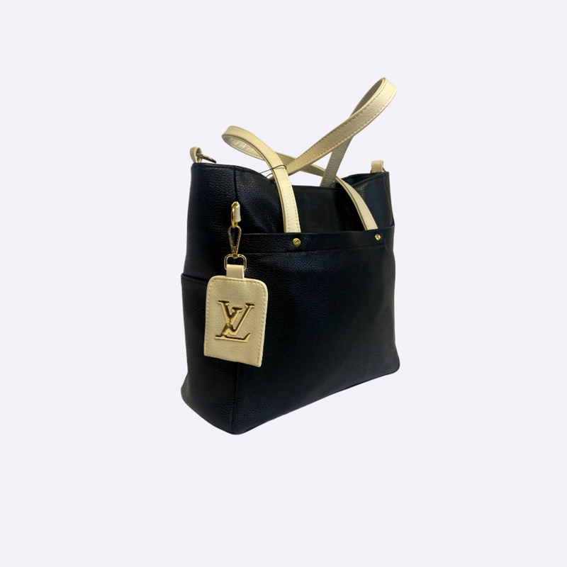 حقيبة يد كبيرة (توت) من الجلد المحبب، ذات مقابض علوية متباينة مع تعليقة شعار مميزة.