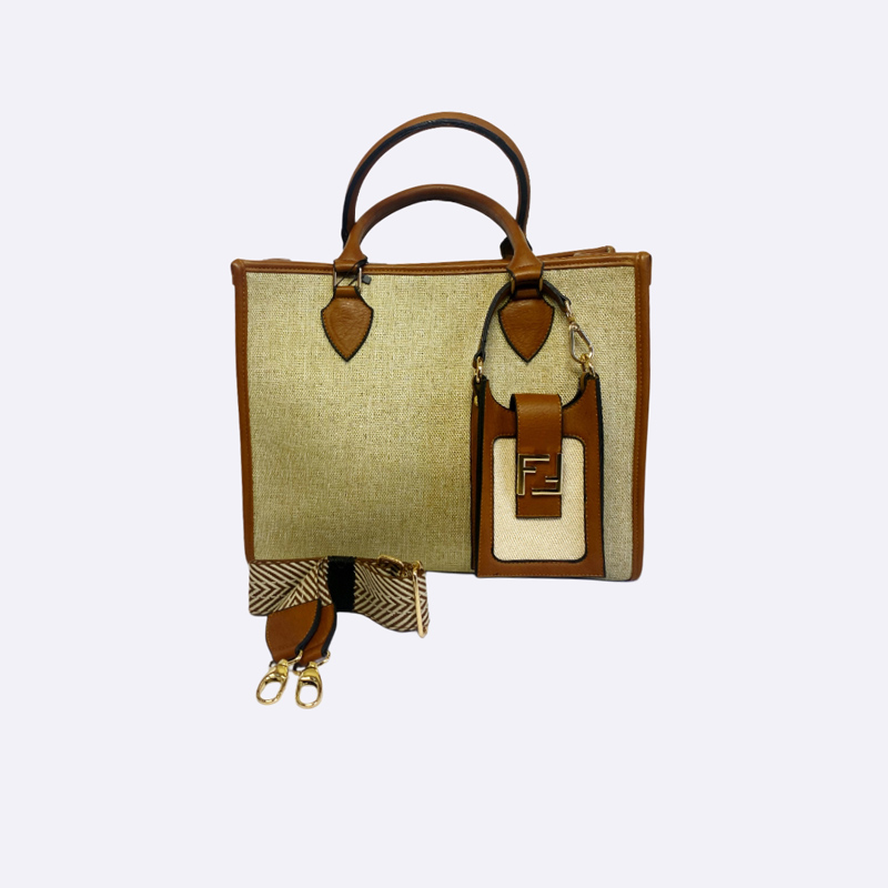 Fendi Style Canvas and Leather Trim Tote with Pouch