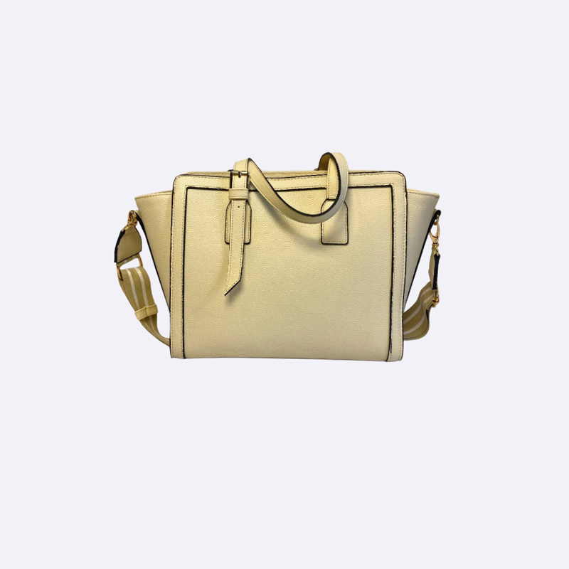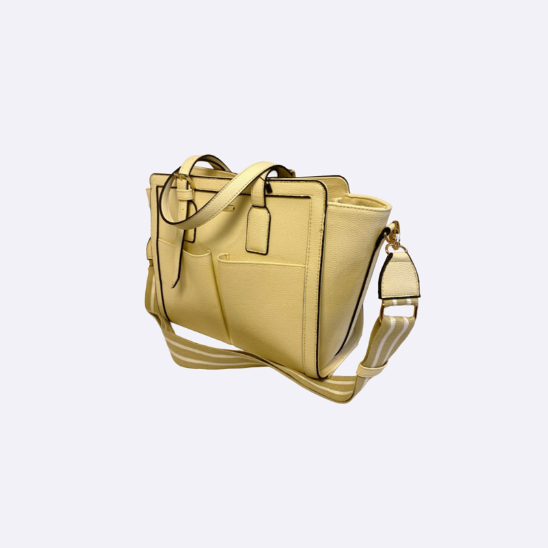حقيبة يد نسائية ذات هيكل منظم وتصميم عملي، مزودة بجيوب أمامية خارجية وحزام كتف قماشي عريض ومخطط.