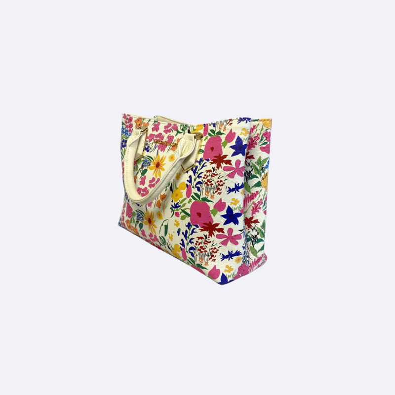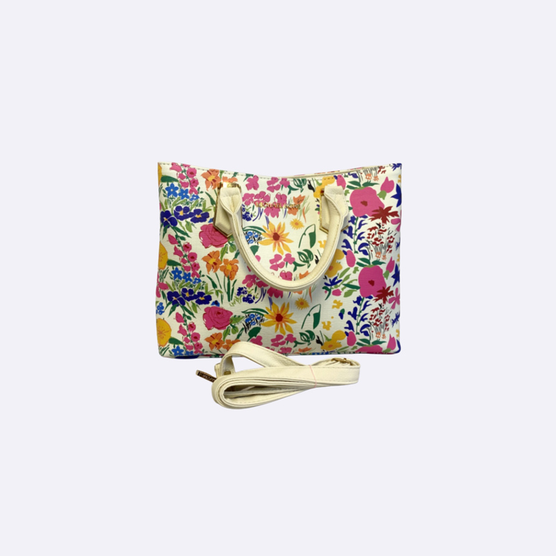حقيبة يد نسائية من القماش بنقشة زهور متنوعة على خلفية فاتحة، مزودة بمقابض علوية وحزام كتف قابل للفصل.
