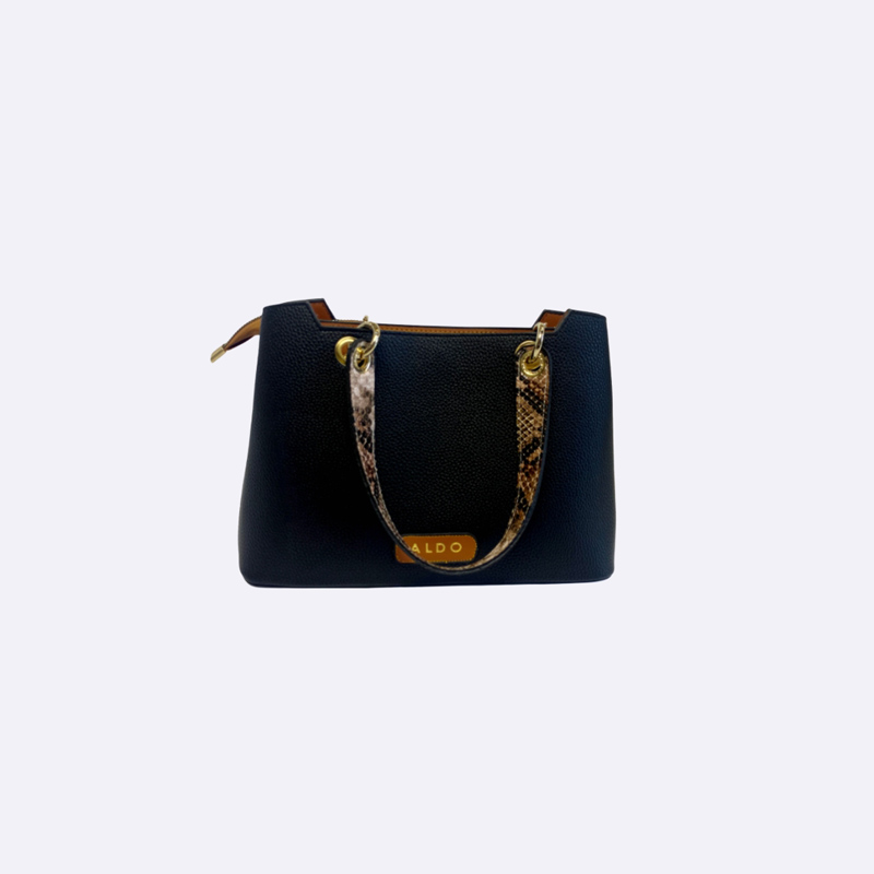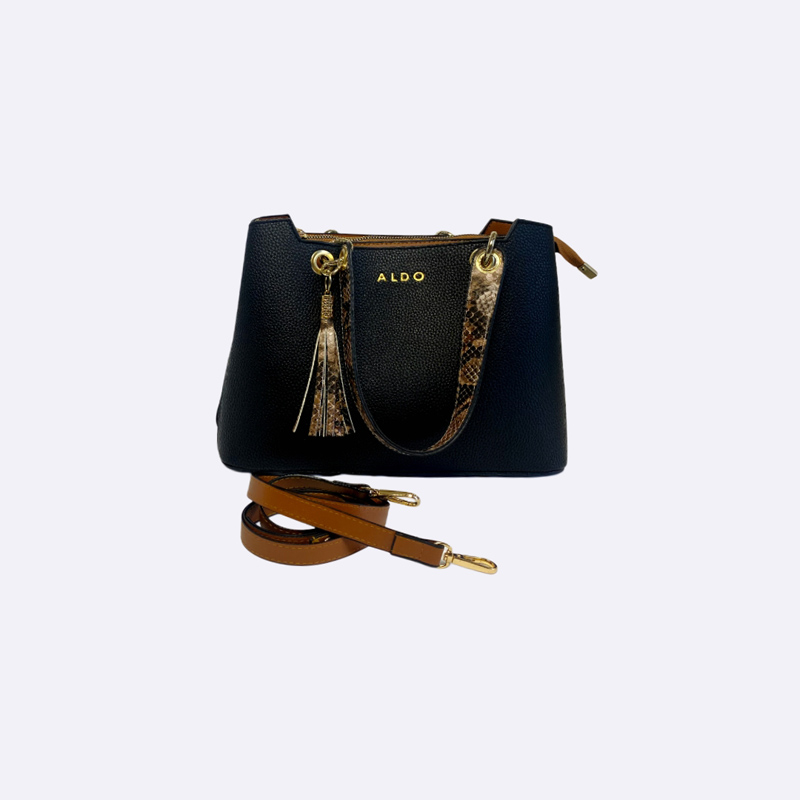 حقيبة يد نسائية ذات تصميم منظم ومقبض علوي، مزودة بتعليقة شرابة جلدية وحزام كتف قابل للفصل بتفاصيل منقوشة.