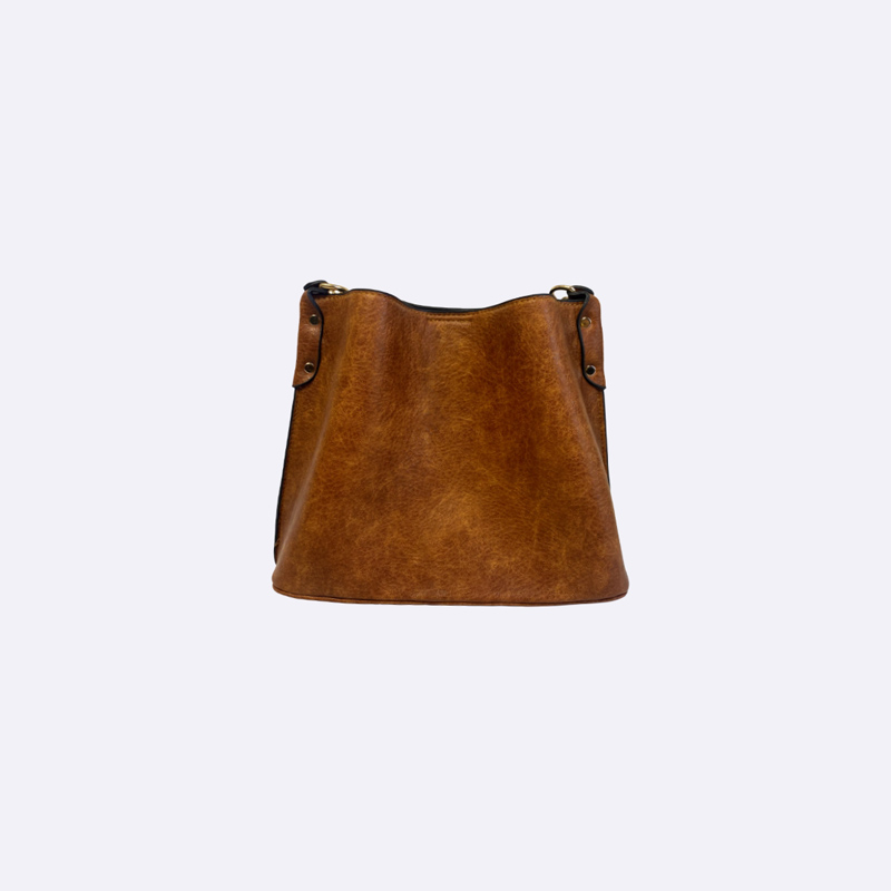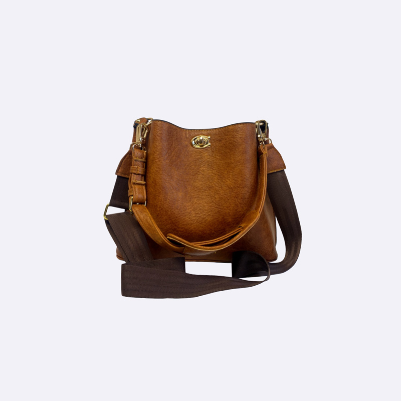 حقيبة نسائية بتصميم دلو صغيرة، ذات نسيج محبب ومزودة بحزام كتف قماشي عريض وحزام رفيع إضافي.