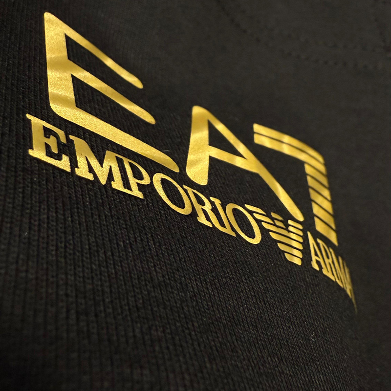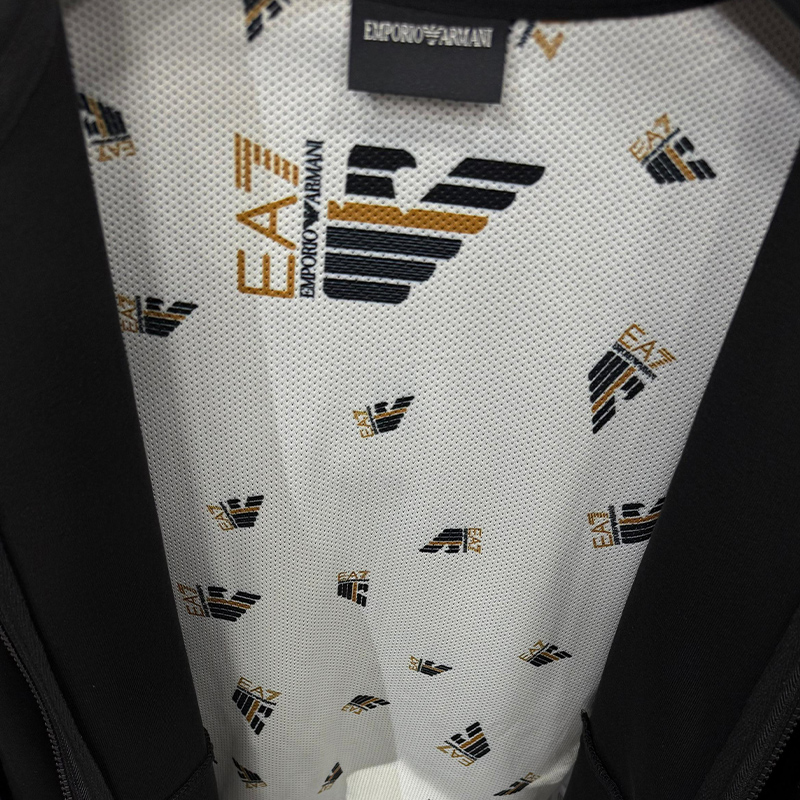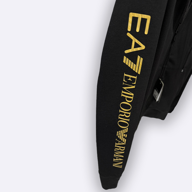 طقم رياضي فاخر مكون من جاكيت مزود بسحاب كامل وقلنسوة وسروال مريح، يتميز بشعار العلامة التجارية (EA7 Emporio Armani) المطبوع على الصدر وعلى طول الأكمام والساقين، ومناسب للارتداء الرياضي واليومي العصري.