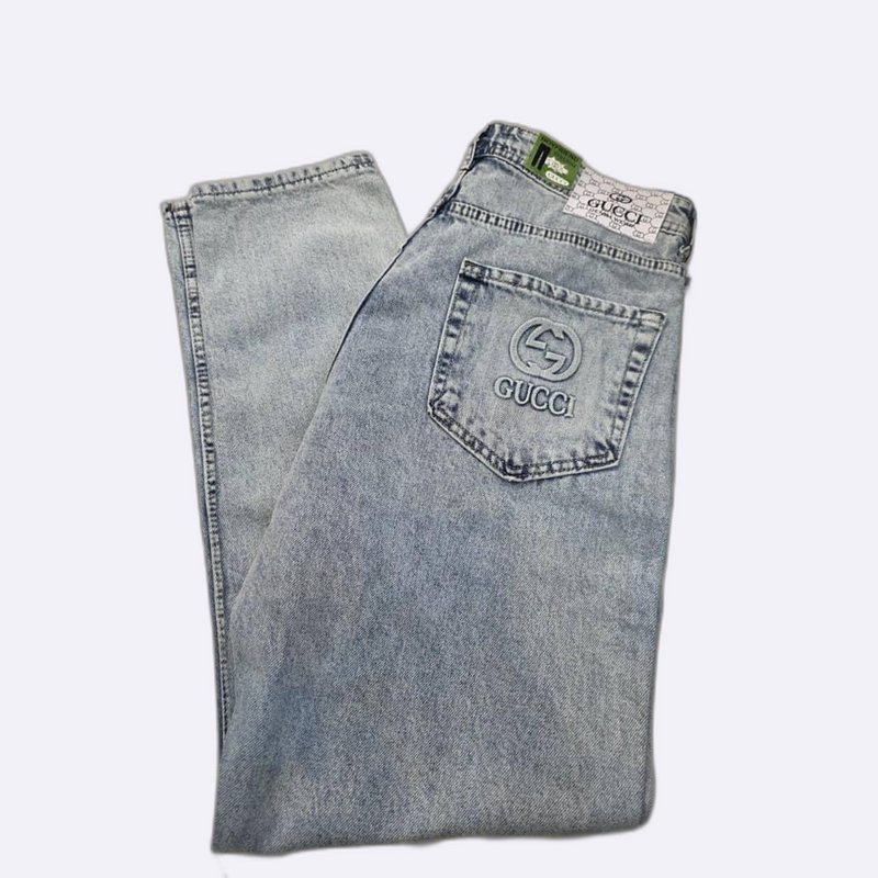 بنطال جينز كلاسيكي يتميز بشعار غوتشي الشهير (G المتداخل) مطرزاً بشكل بارز على الجيب الخلفي.