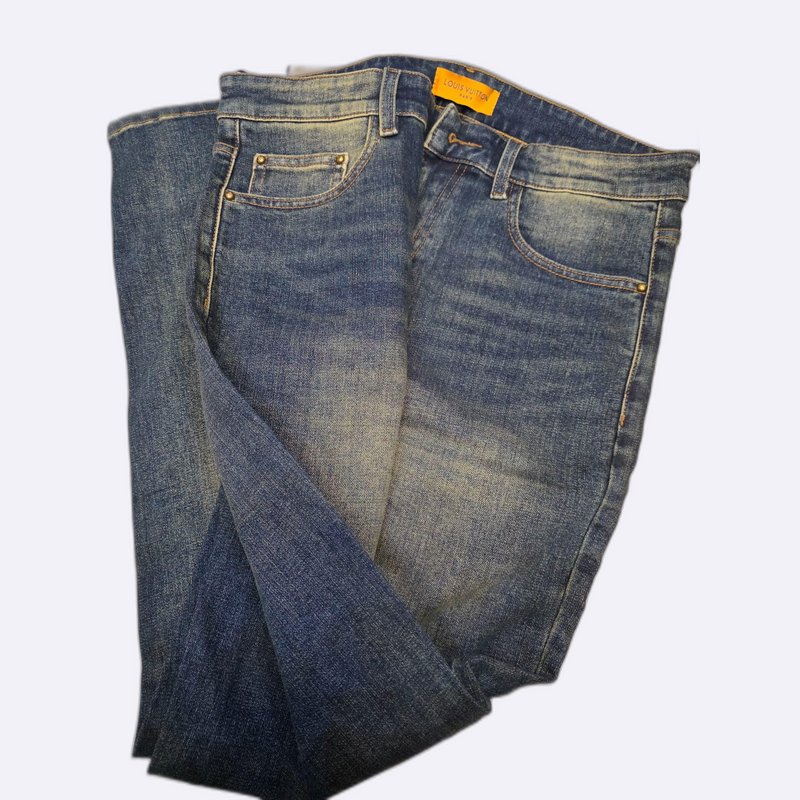 بنطال جينز أزرق كلاسيكي بخصر متوسط الارتفاع يظهر عليه ملصق داخلي باللون البرتقالي يحمل اسم العلامة التجارية باريس.