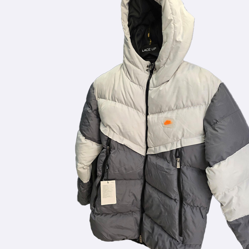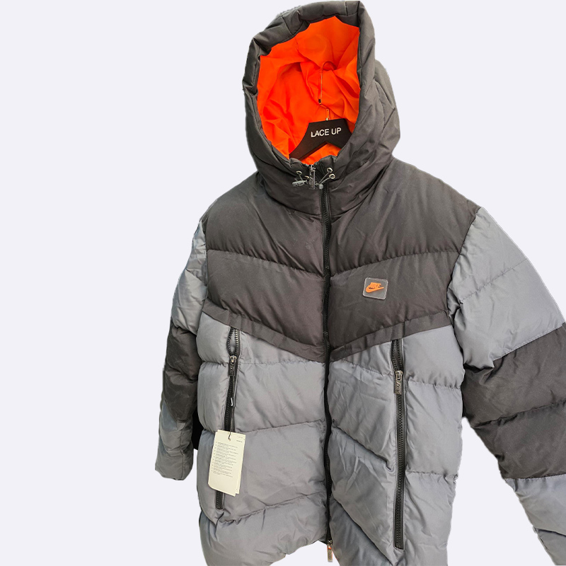 سترة منفوخة بظلال اللون الرمادي تتميز ببطانة داخلية برتقالية زاهية وشعار نايكي كلاسيكي صغير على الصدر.