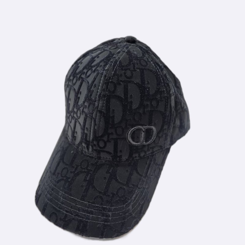 قبعة رجالية فاخرة باللون الأسود بالكامل، تتميز بنقشة شعار ديور (Oblique) الشهيرة المنسوجة على كامل القبعة مع شعار CD مطرز على الجانب.