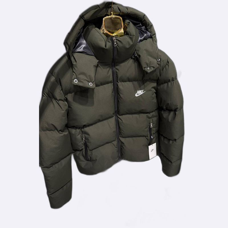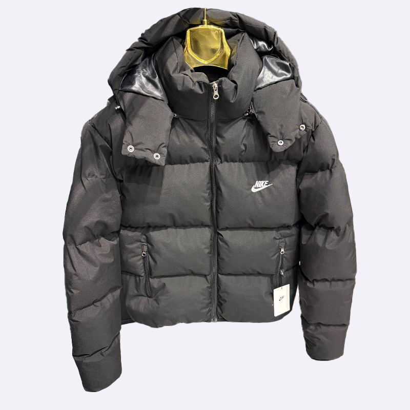 سترة شتوية رجالية منفوخة باللون الأسود، تتميز بتصميم مبطن لتوفير الدفء مع قلنسوة قابلة للتعديل وشعار نايكي الصغير باللون الأبيض على الصدر.