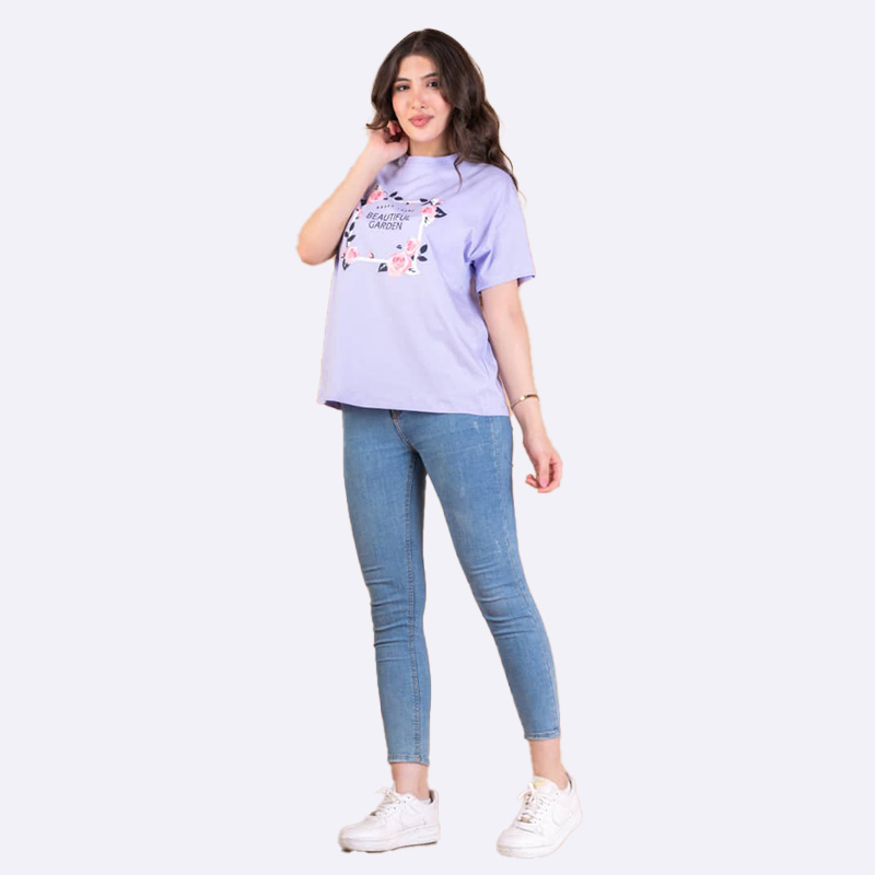تي شيرت نسائي بأكمام قصيرة وطبعة جرافيكية وزهور أمامية، بقصة مريحة وعصرية للارتداء اليومي.